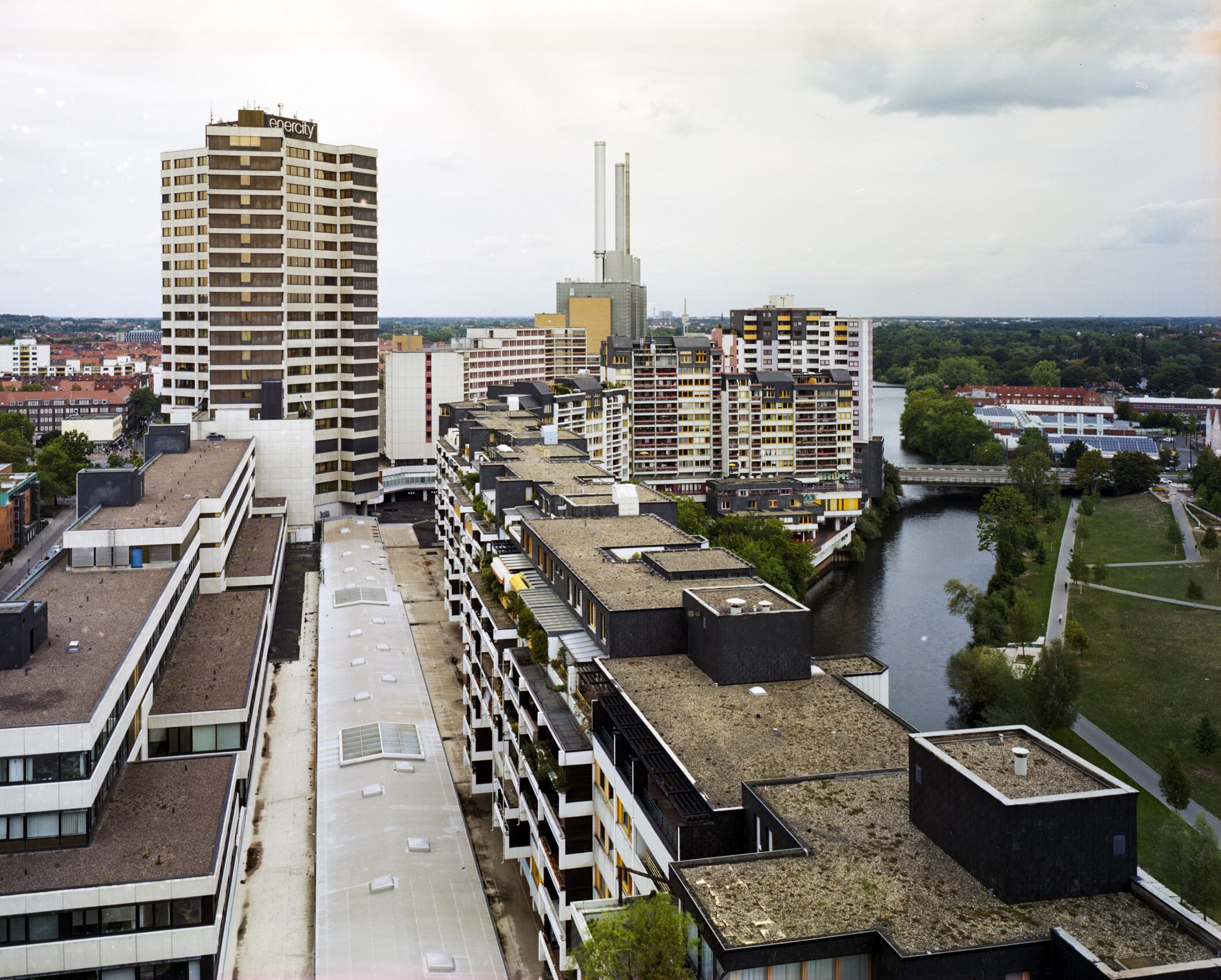 Das Gebäude liegt wie ein 500 Meter langes Schiff in der Stadtstruktur zwischen dem Fluss Ihme und der Blumenauer Strasse. Es wurde auf dem Gelände einer Weberei gegenüber einer Brauerei errichtet; sein Sockel nahm Parkplätze und die Infrastruktur für das darüber liegende Einkaufszentrum auf. Heute hat der Sockel seine Funktion verloren und steht seit über zwanzig Jahren leer; der industrielle Kontext hat sich längst gewandelt, und die Blumenauer Strasse spielt im städtischen Verkehrsnetz nur noch eine untergeordnete Rolle.
