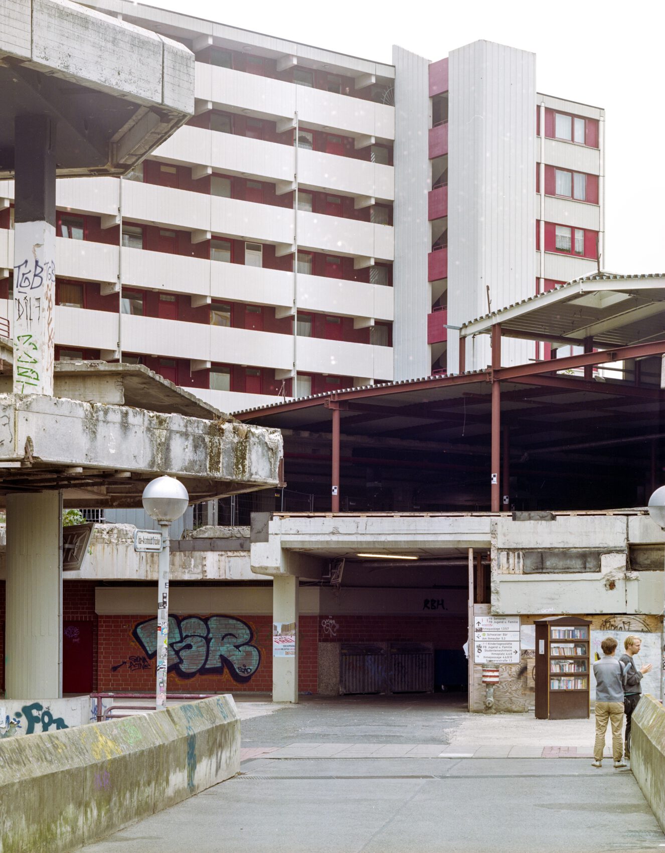 Before Ihme-Zentrum was build there was a weaving mill on it’s land and a brewery on the other side of the Blumenauer Street. Thus this street has always been a mere infrastructure project accompanied by closed ground floors without any public function. Ihme-Zentrum was build in the same spirit: The base accommodated a zone for parking and delivery on the ground floor and a shopping mall above. Today the entire base is abandoned for twenty years already.
