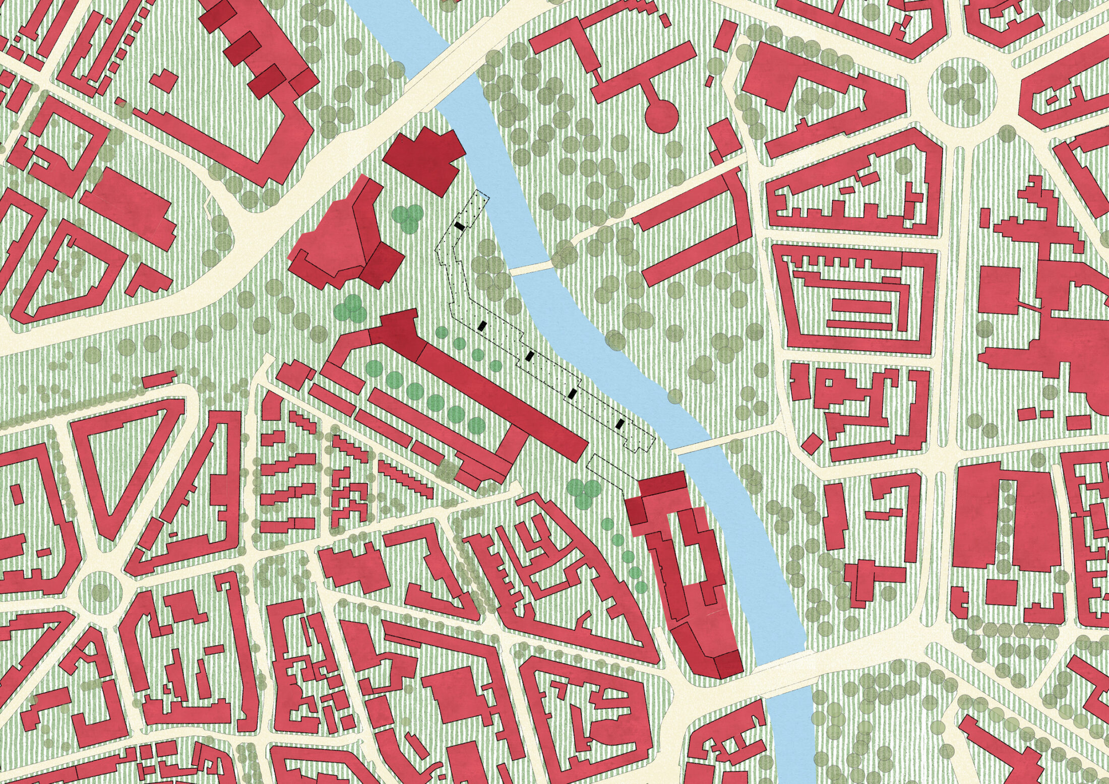 Wir schlagen vor, die Blumenauer Strasse in die leerstehende Tiefgarage des Ihme-Zentrums zu verlegen und einen grossen Teil des Sockelbaus abzureissen. Dadurch wird das überdimensionierte Gebäude in mehrere Teile gegliedert und auf Strassenniveau entsteht ein städtischer Platz. – Durch diese Fragmentierung wird das Ihme-Zentrum Teil der Stadt, und die Stadt erhält über eine öffentliche Terrasse Zugang zum Fluss.
