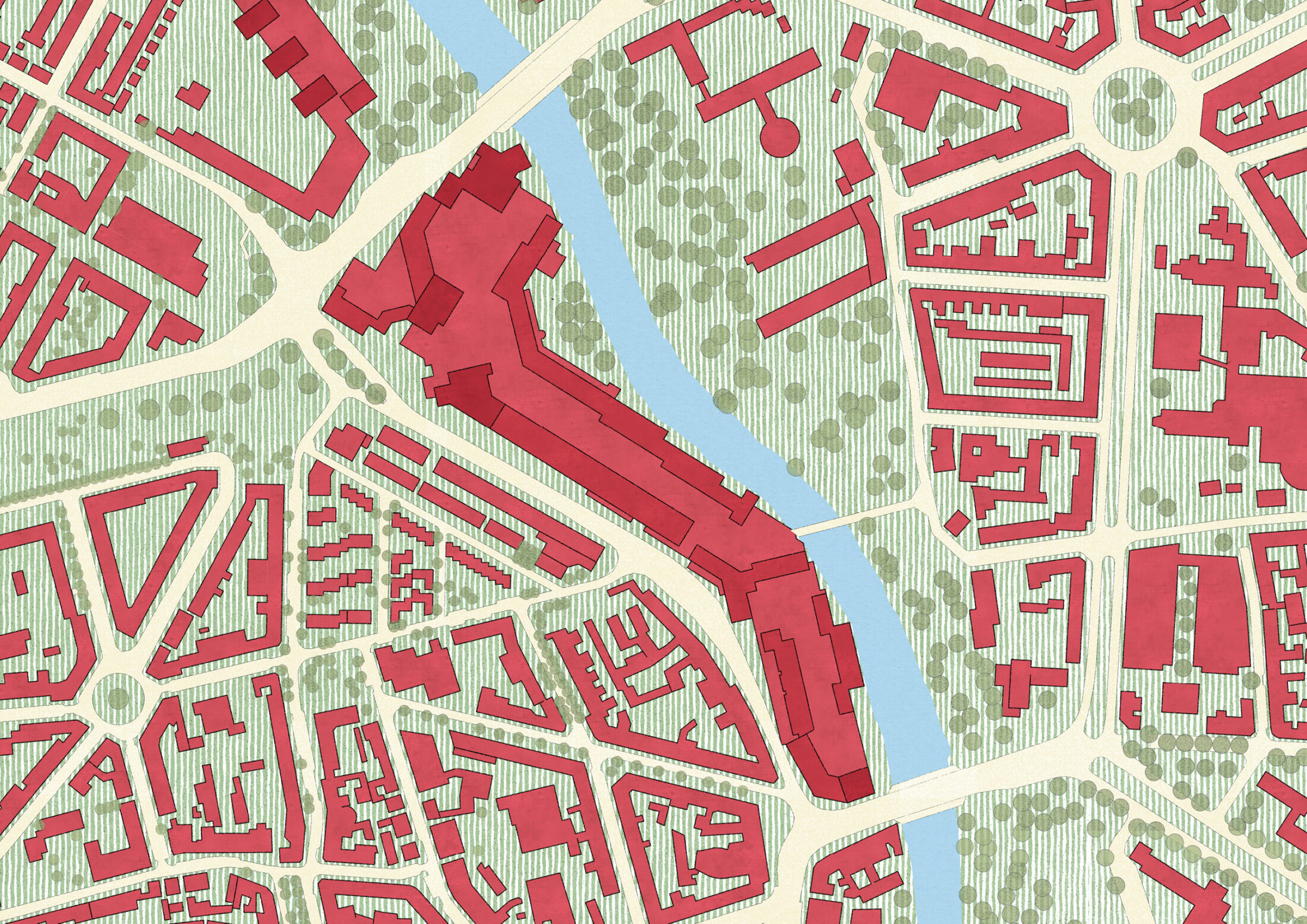 We propose to relocate Blumenauer St. into the vacant underground parking of Ihme-Zentrum and to tear down a major part of the base. Thereby the oversized building is split into several parts and an urban square is generated on street level. – Through it’s fragmentation Ihme-Zentrum becomes part of the city and the city gets access to the river through a public terrace.