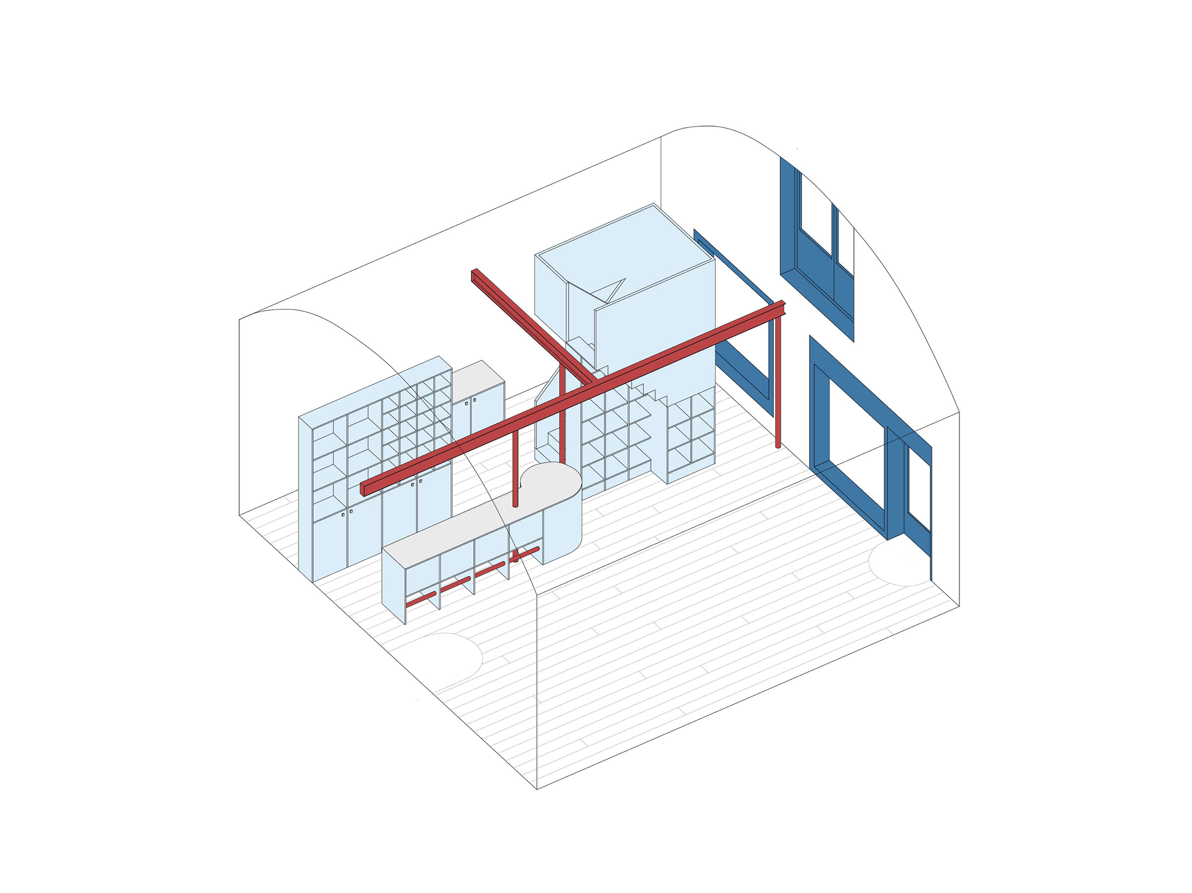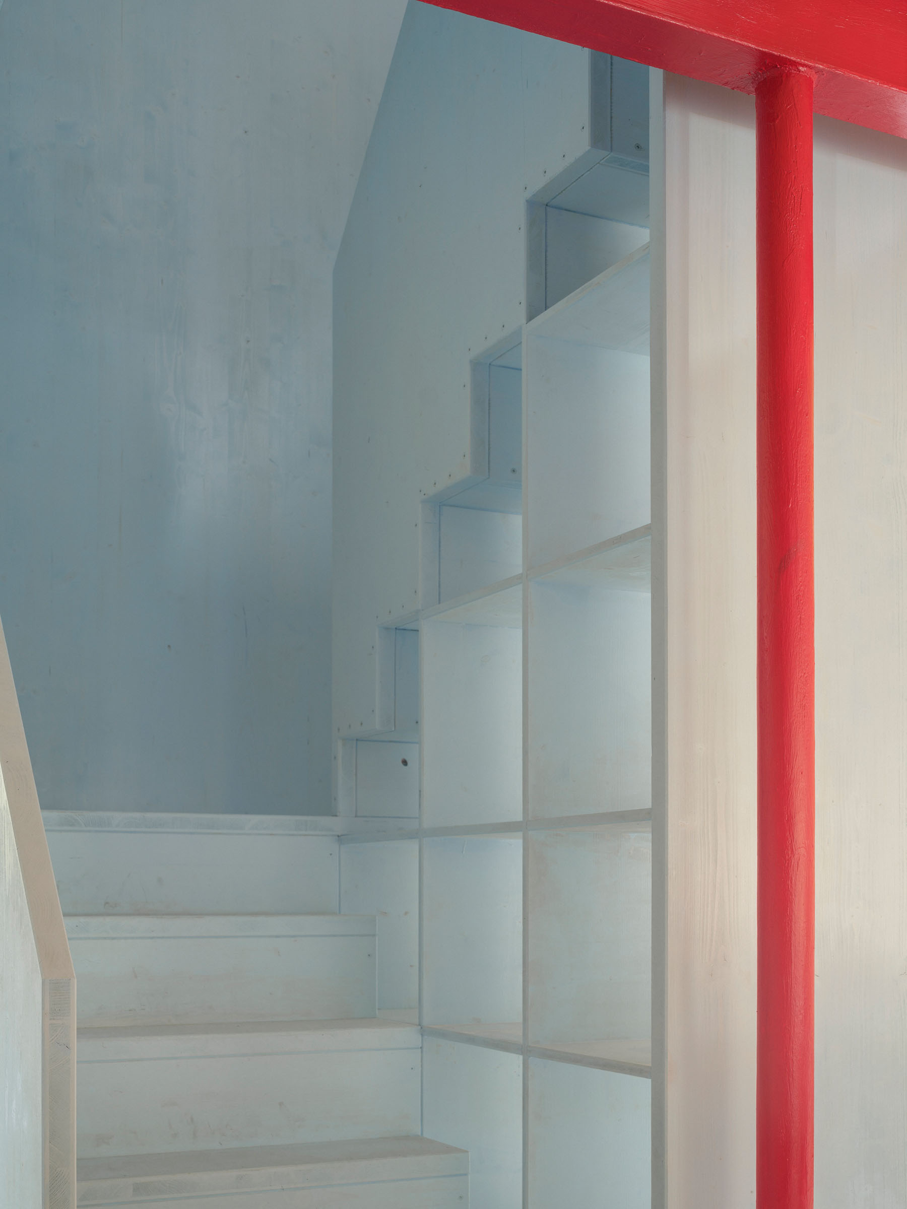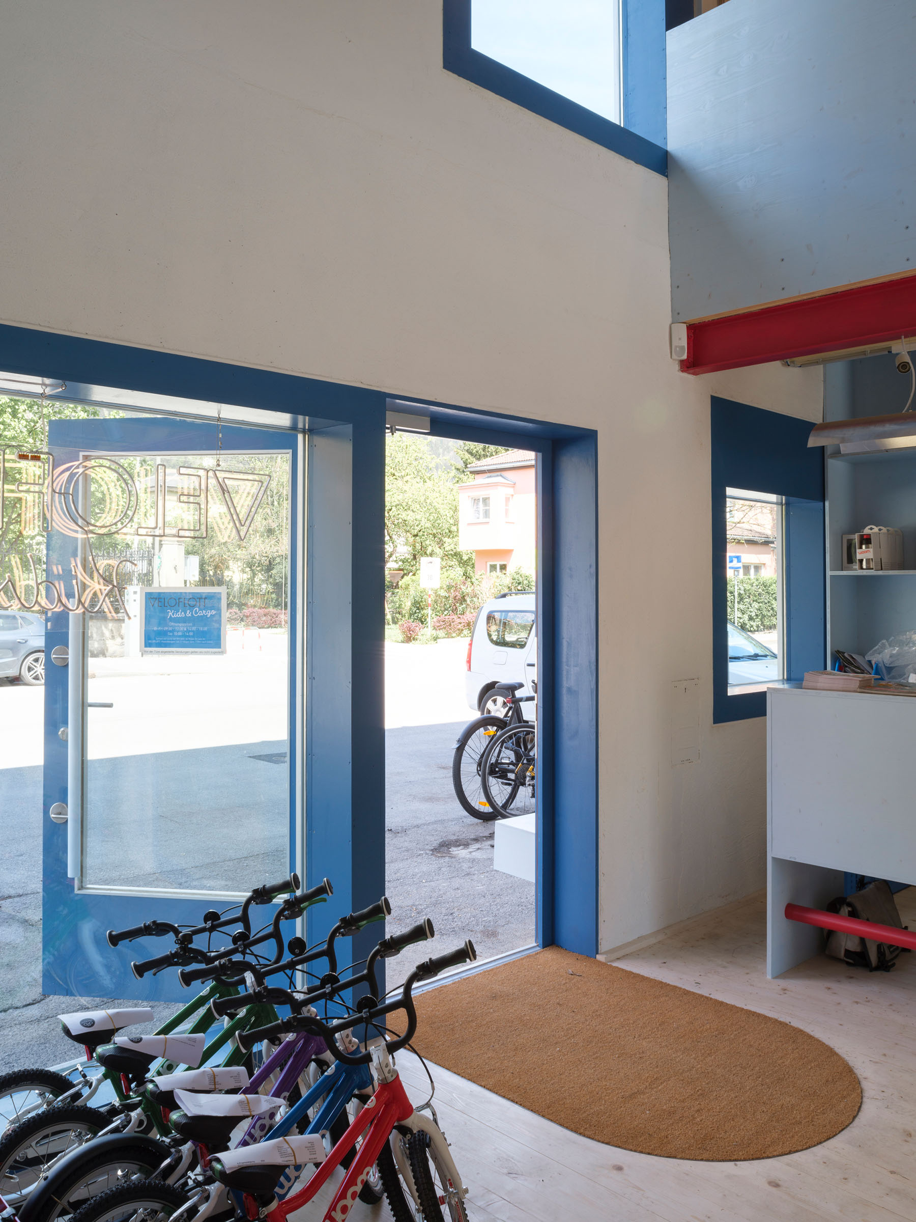We were asked to convert a former darts club into a bicycle shop with storage and a small workshop on the upper floor. In addition to the maximum utilization of the existing structure and the re-use of existing materials, we tried to use the program in order to create new qualities of public space.