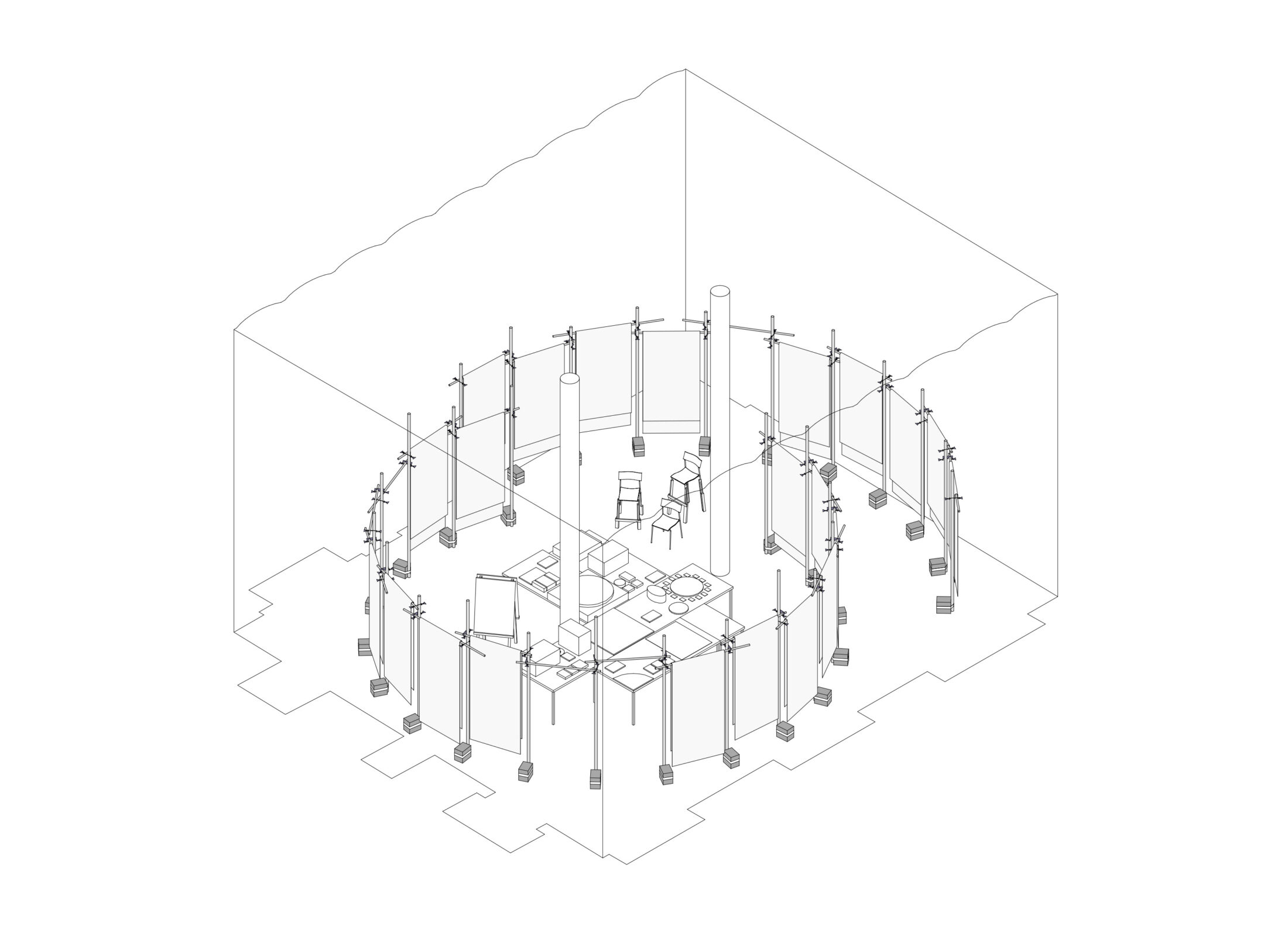 Die räumliche Grundstruktur besteht aus zwei sich überlagernden offenen Kreisen, die an elementare architektonische Formen erinnern, die mit demokratischen Versammlungen in Verbindung gebracht werden. Die vorgestellten Projekte sind als große Stoffbahnen in diesem Rahmen eingehängt und bilden eine vorhangartige räumliche Einfassung, die leicht und durchlässig bleibt. Die Struktur ist flexibel: Elemente können hinzugefügt, verschoben oder entfernt werden, was eine kontinuierliche Veränderung ermöglicht.