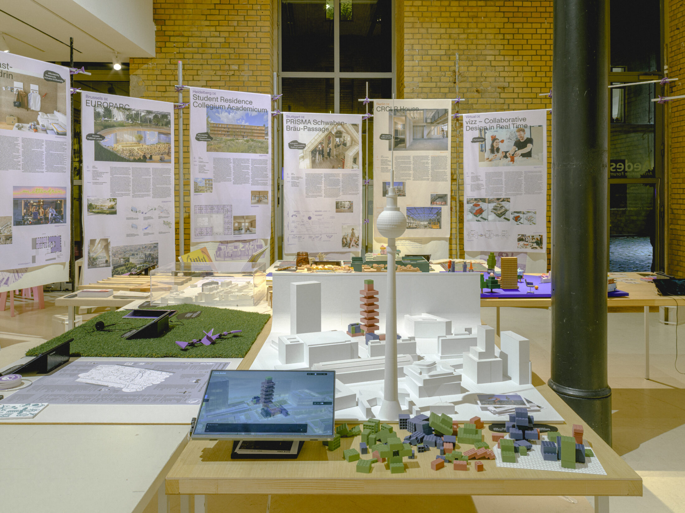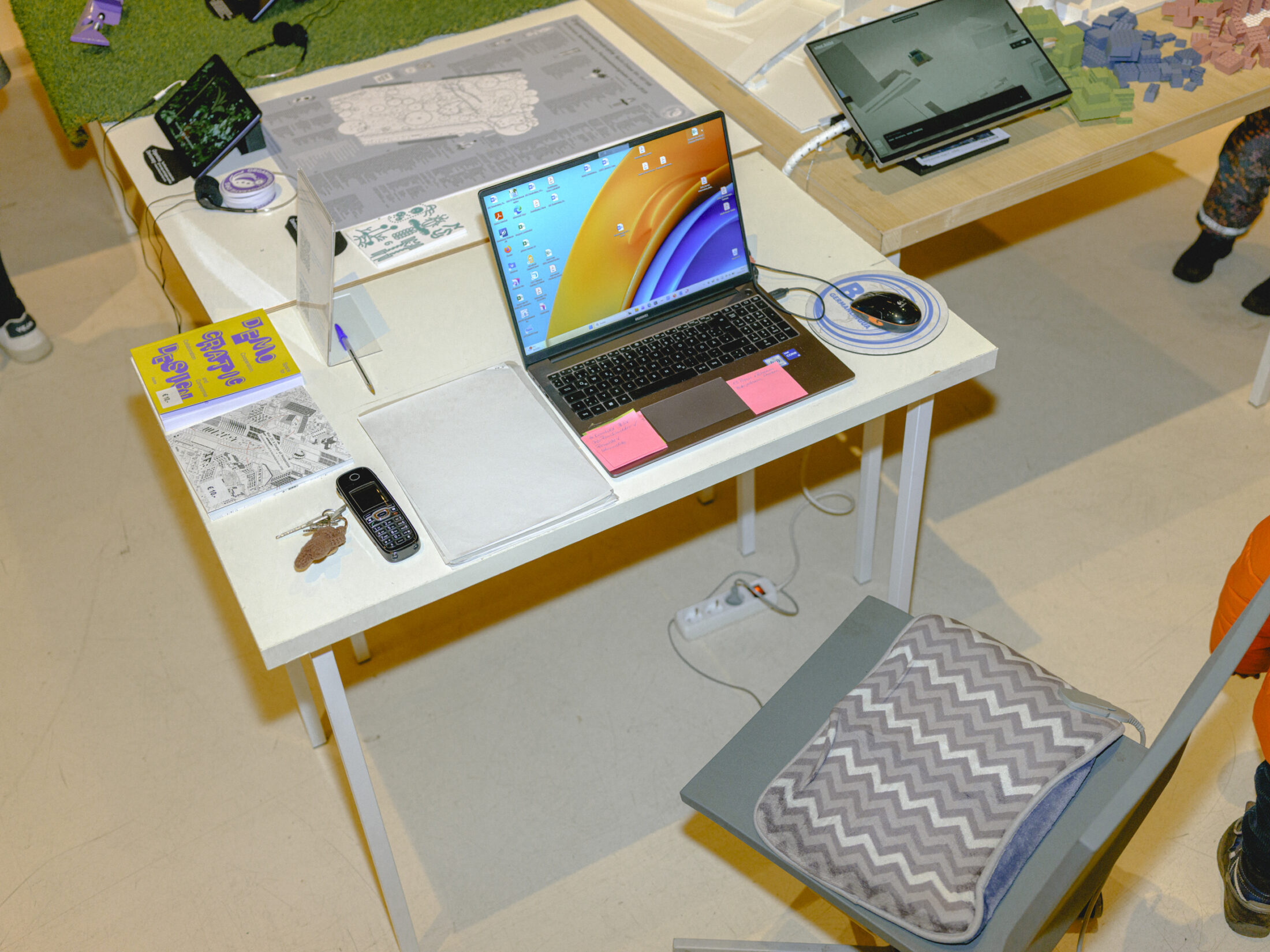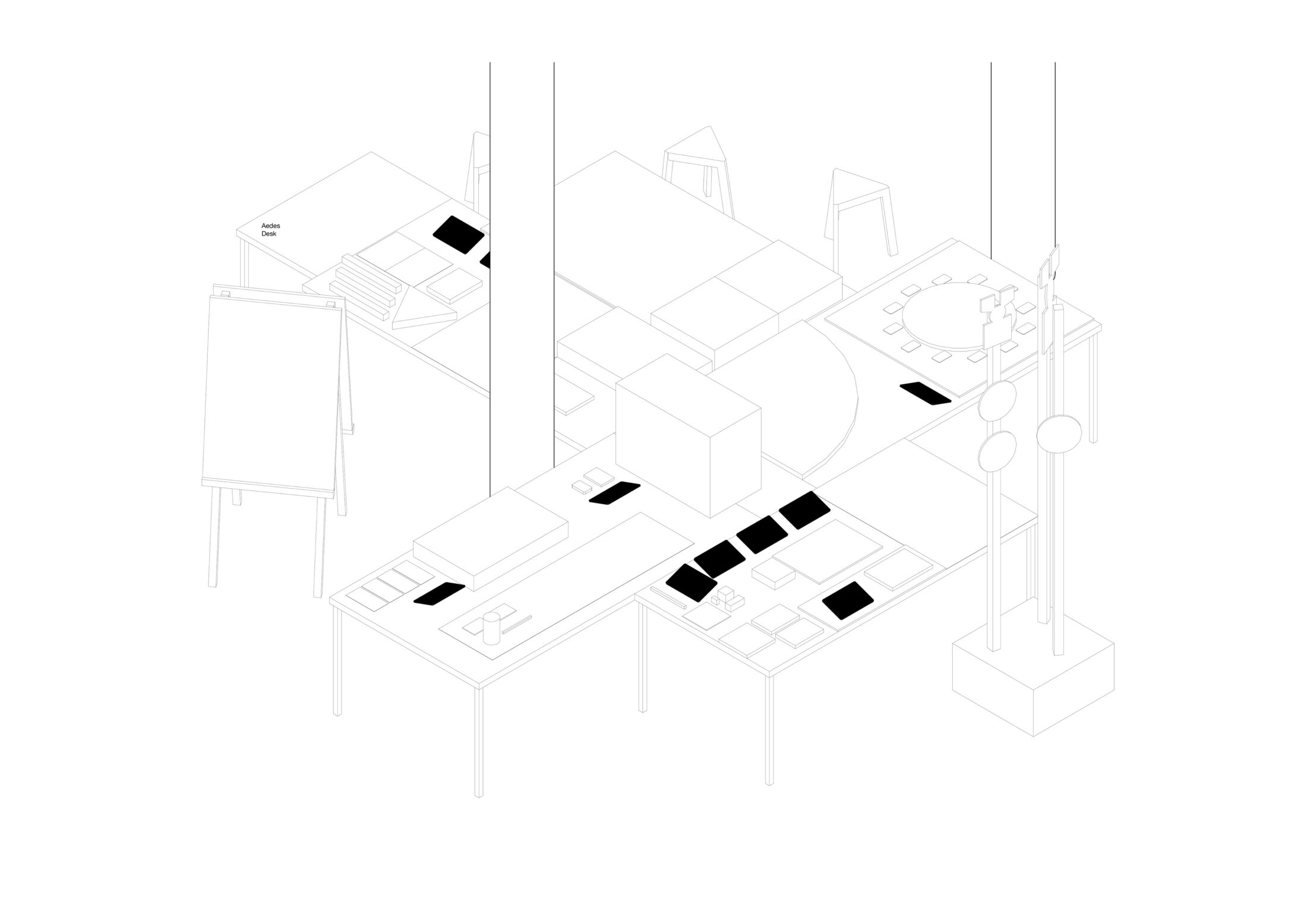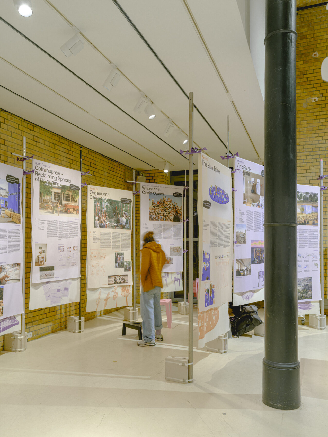 Ein großer Tisch, der aus gefundenen Tischplatten unterschiedlicher Größe zusammengesetzt wurde, bildet das zentrale Element des Raums. Hier können Besucher Platz nehmen und sich mit zusätzlichem Material beschäftigen, das die ausgestellten Projekte vertieft: Architekturmodelle, partizipative Kartenspiele, Filme und eine Reihe von Dokumenten. Ein mobiler Bücherwagen bietet weitere Lektüre an, sodass Besucher tiefer in bestimmte Themen eintauchen können.