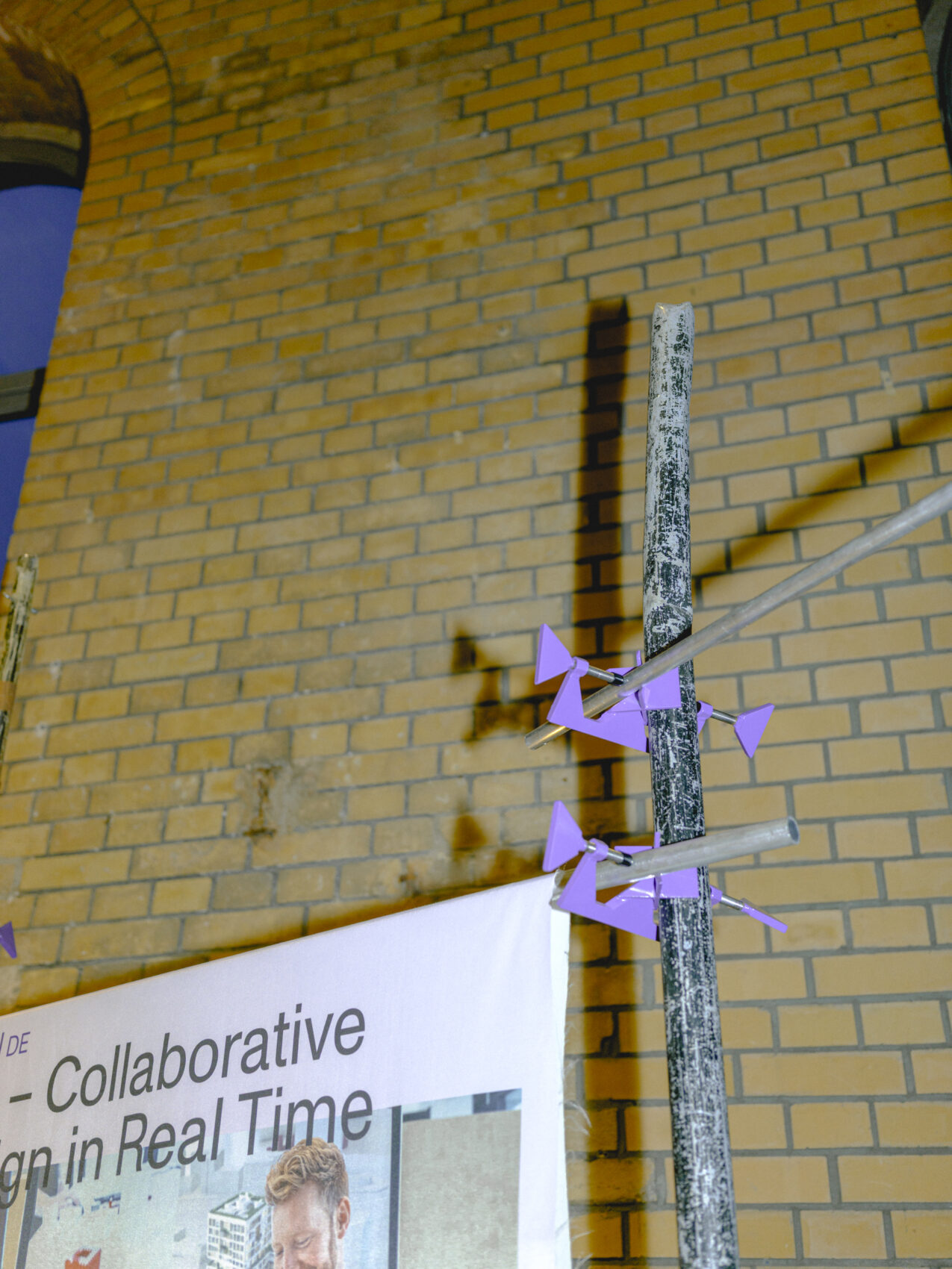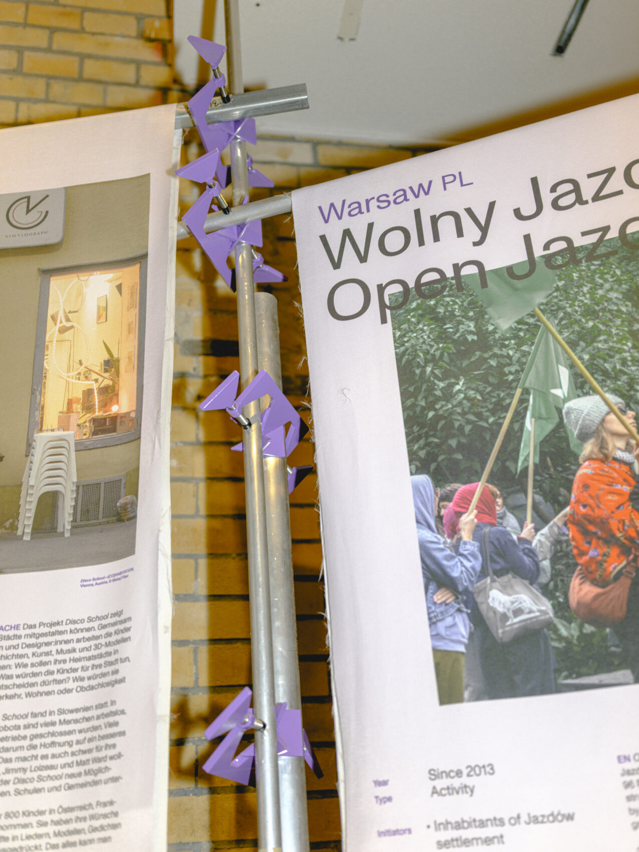 The basic spatial structure consists of two overlapping open circles, reminiscent of elementary architectural forms associated with democratic assemblies. The presented projects are suspended within this framework as large fabric panels, forming a curtain-like spatial enclosure that remains light and permeable. The structure is flexible: elements can be added, moved, or removed, allowing for continuous transformation.