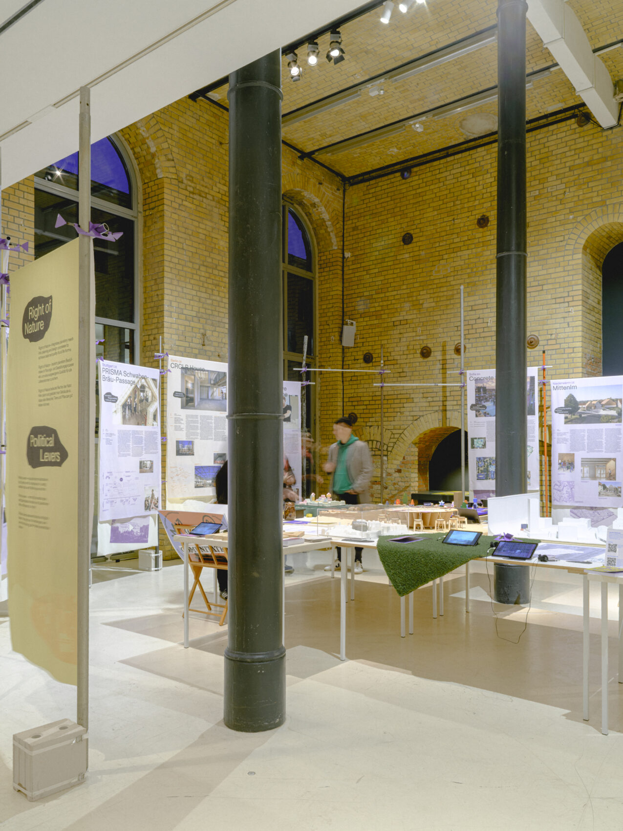 A large table, assembled from found tabletops of varying sizes, forms the central element of the space. Visitors can sit here and engage with supplementary material that expands on the exhibited projects: architectural models, participatory card games, films, and an array of documents. A mobile book cart offers further reading, allowing visitors to explore specific themes in greater depth.