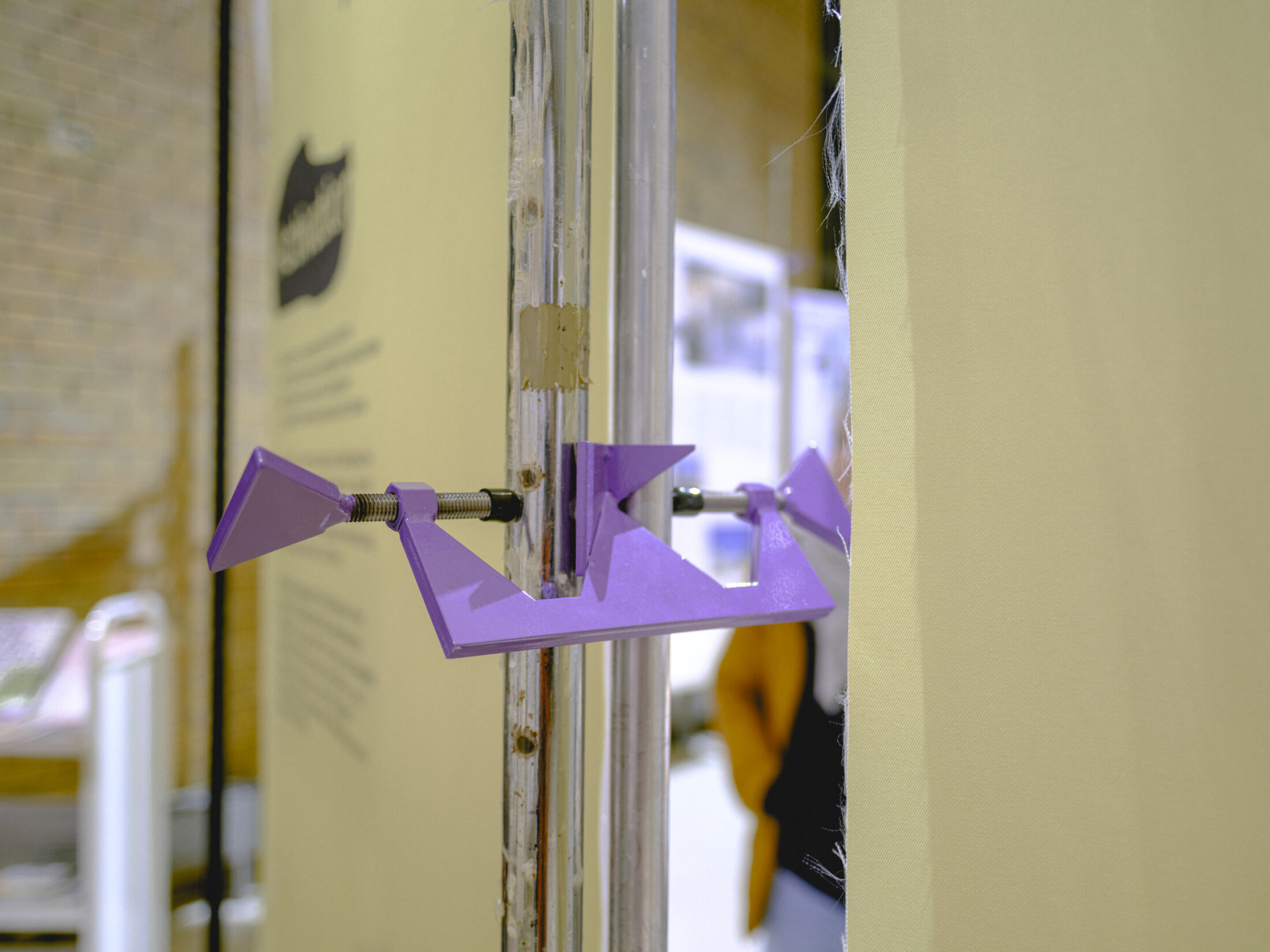 The only new design element is a custom-made clamp that connects pipes of varying diameters—forming a three-dimensional spatial structure that supports the 22 projects on display.