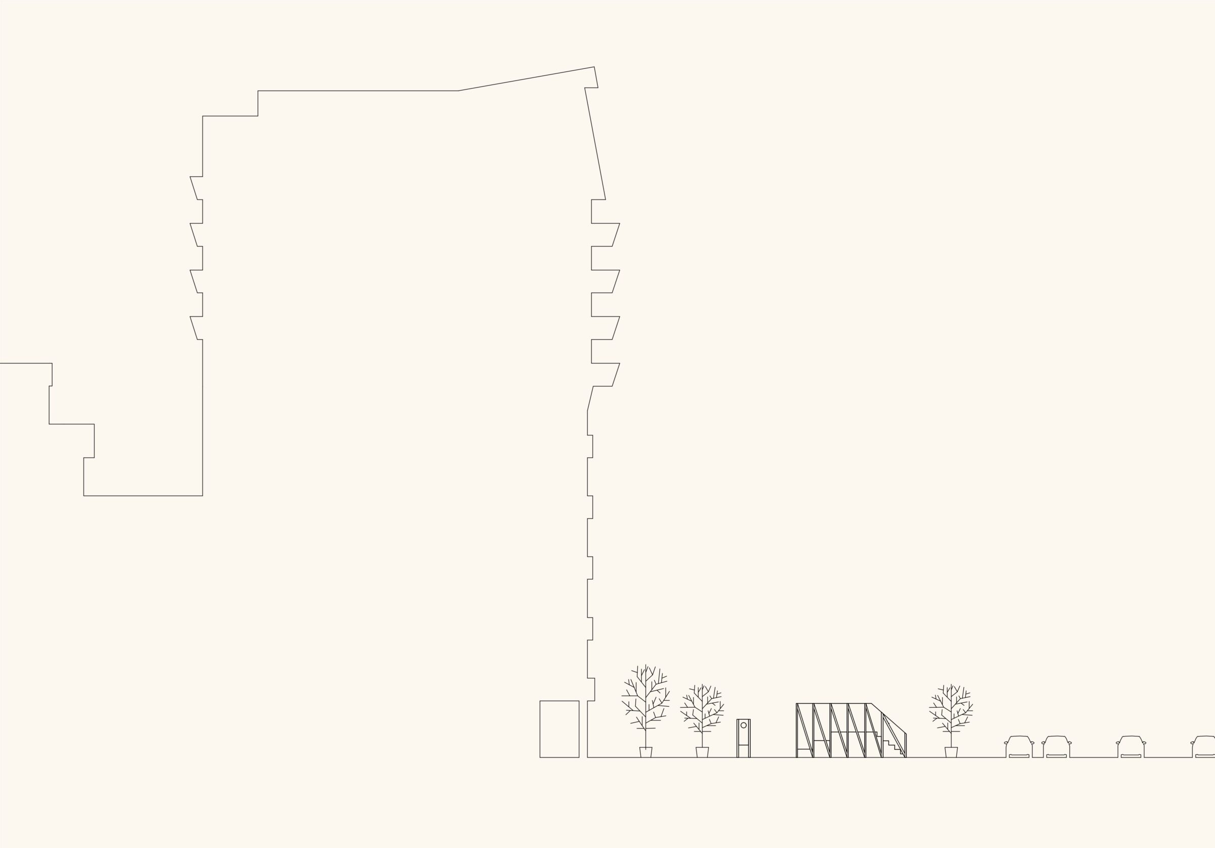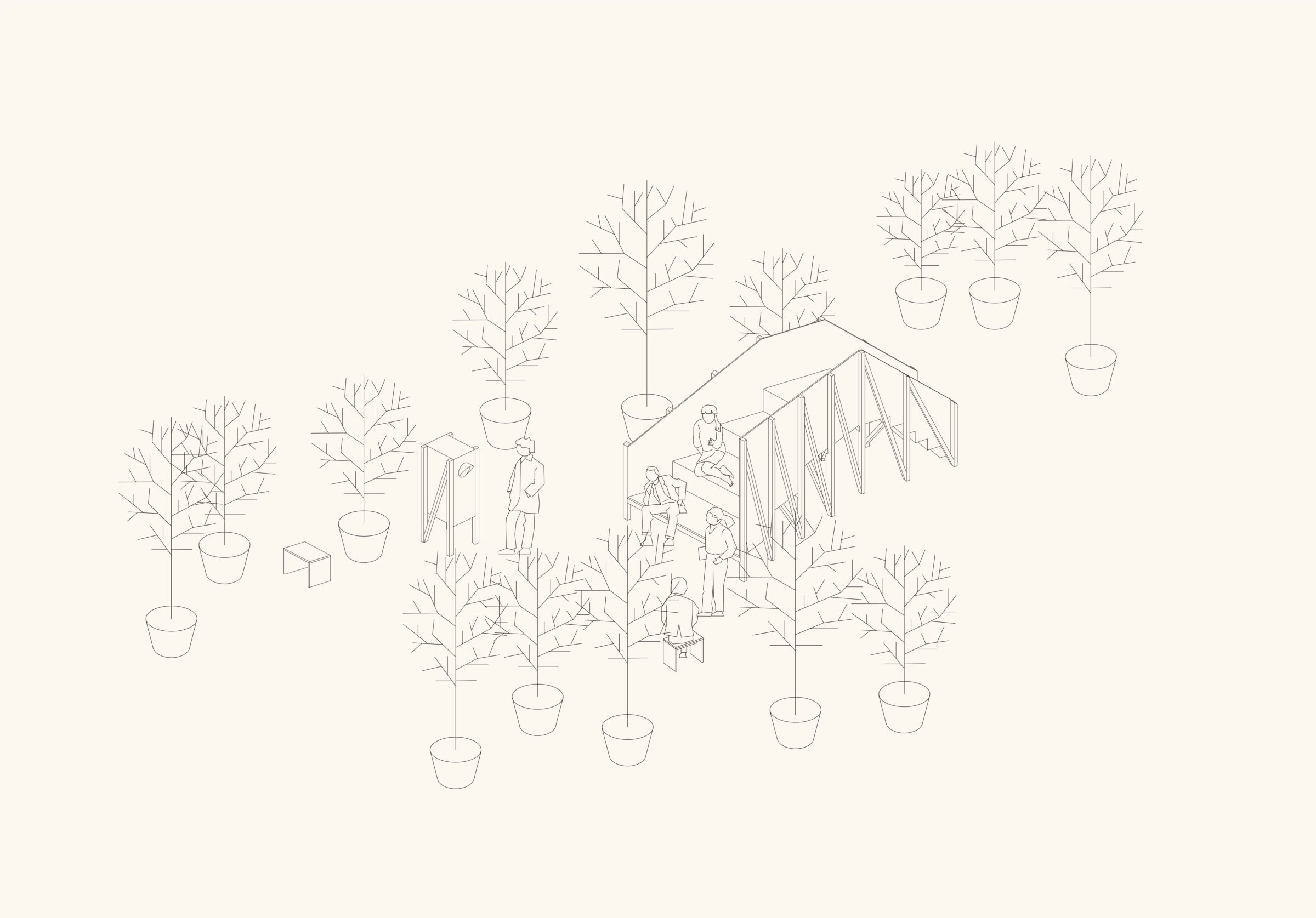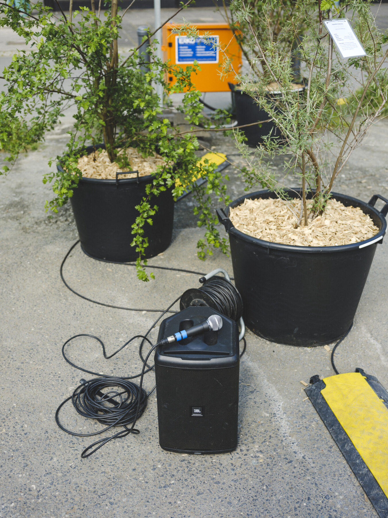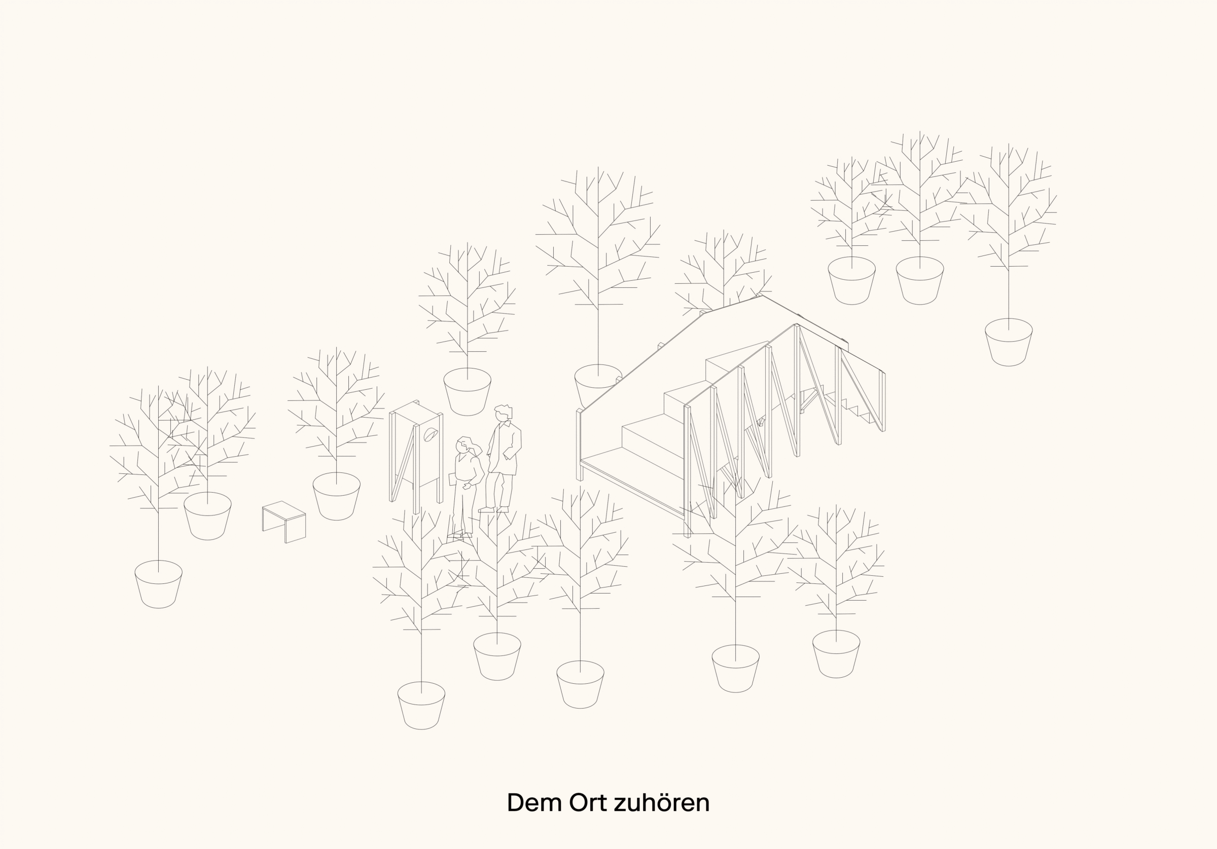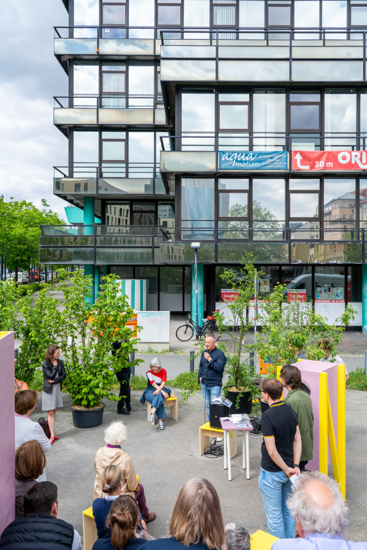 Während der Sommermonate wurde der Ort zu einem Raum für Austausch und Aufenthalt: Eine Sitztribüne lud zum Verweilen ein und richtete den Blick neu auf das Gebäude. Eine Sprechbox machte die Geschichten des Ortes über eine Audioinstallation hörbar. Temporäres Grün spendete Schatten und wurde zum Habitat für Insekten und Kleintiere.