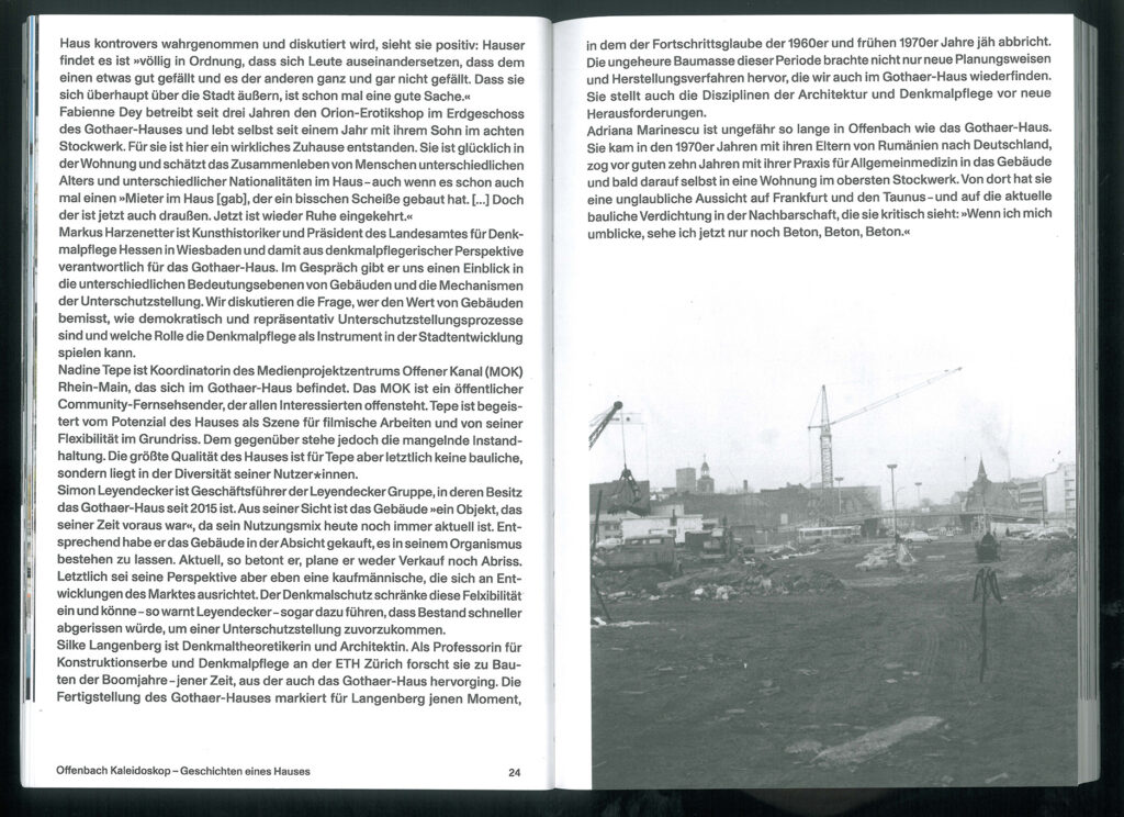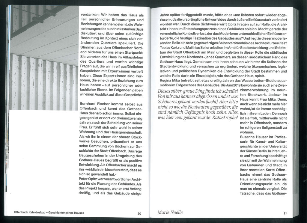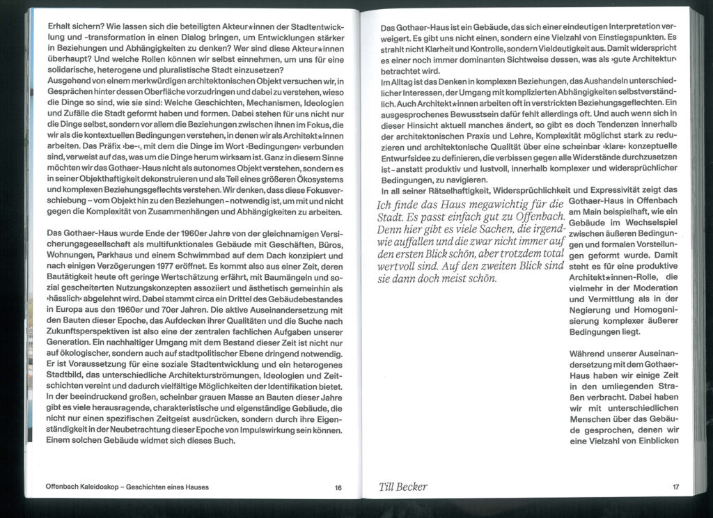 Aus Recherchen zum Haus entstand die Buchveröffentlichung “Offenbach Kaleidoskop – Geschichten eines Hauses” (Spector Books, 2022). Das Gothaer-Haus wird hier zum Ausgangspunkt von Gesprächen, in denen persönliche und fachliche Beziehungen zum Haus hinter seine spiegelnde Oberfläche führen, um das Gebäude als Bestandteil eines komplexen Beziehungsnetzes zu dekonstruieren. Dies ist der Versuch, nicht nur die Betrachtungsweise eines besonderen Einzelobjekts erweitern, sondern zugleich den Blick neu auszurichten, um den Wert von Gebäuden im Beziehungsgeflecht ihrer Geschichten sichtbar zu machen.