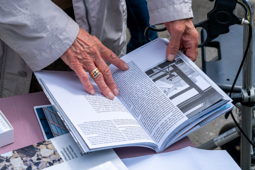 An on-site installation accompanied the book and served several purposes. It made the research accessible to a broad audience and ensured that the discourse on the building’s future remained local. In collaboration with the Offenbach City Planning Office, the parking lot in front of the building was temporarily transformed into a traffic-free public space.