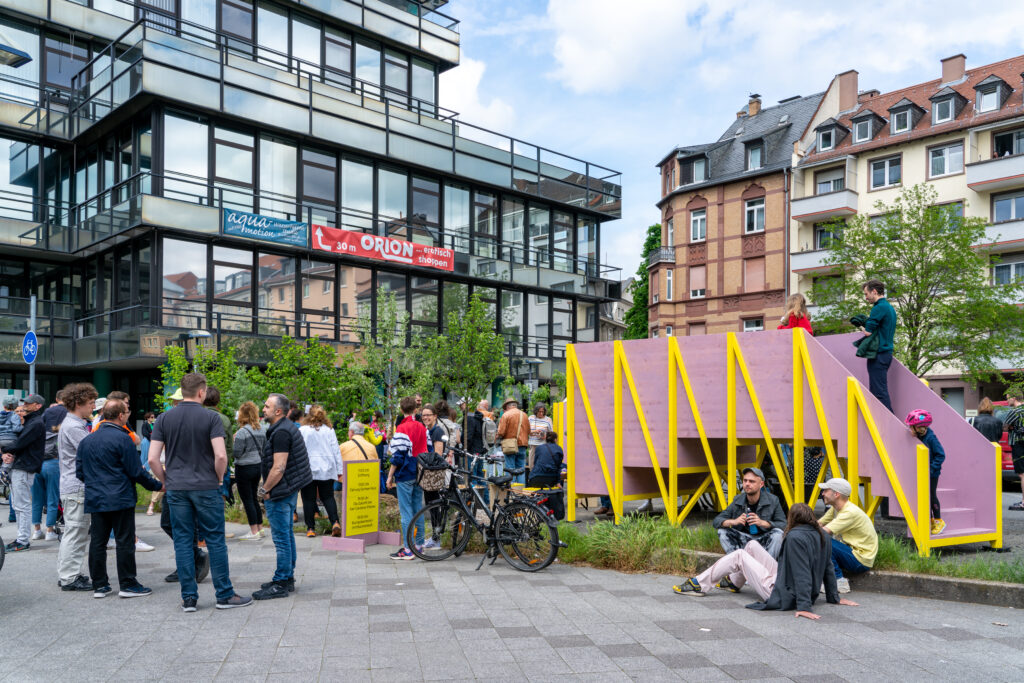 This intervention occurred against the backdrop of the Gothaer-Haus neighborhood’s ongoing transformation: New buildings are being constructed, and the current parking lot, Karl-Carstens-Platz, is set to become a car-free public space. In collaboration with the Office of Planning and Construction of the City of Offenbach, six parking spaces were temporarily closed off during the summer months of 2023 and tested as a public space. This served as a pilot project to gather insights for the future transformation of the site.