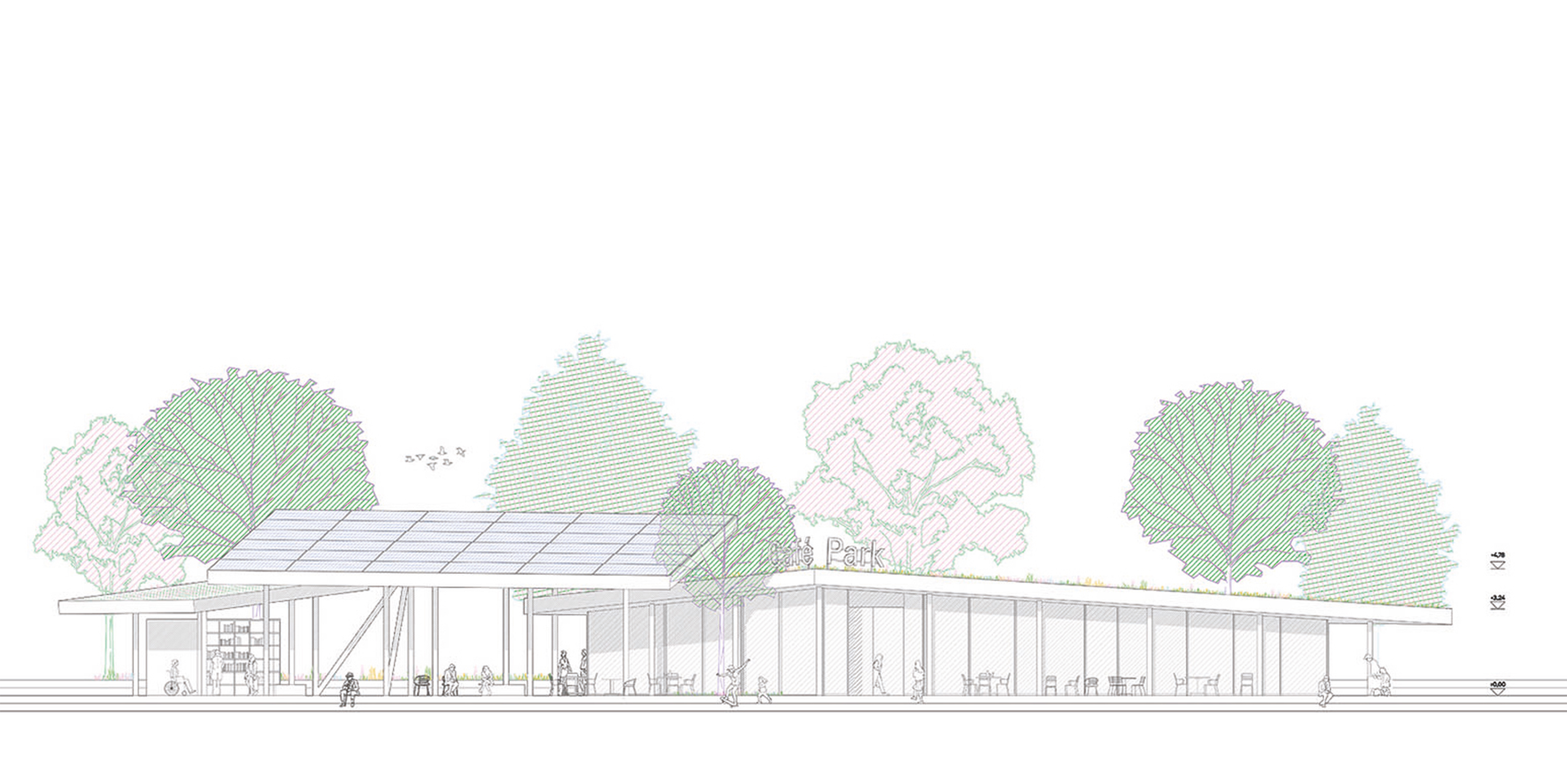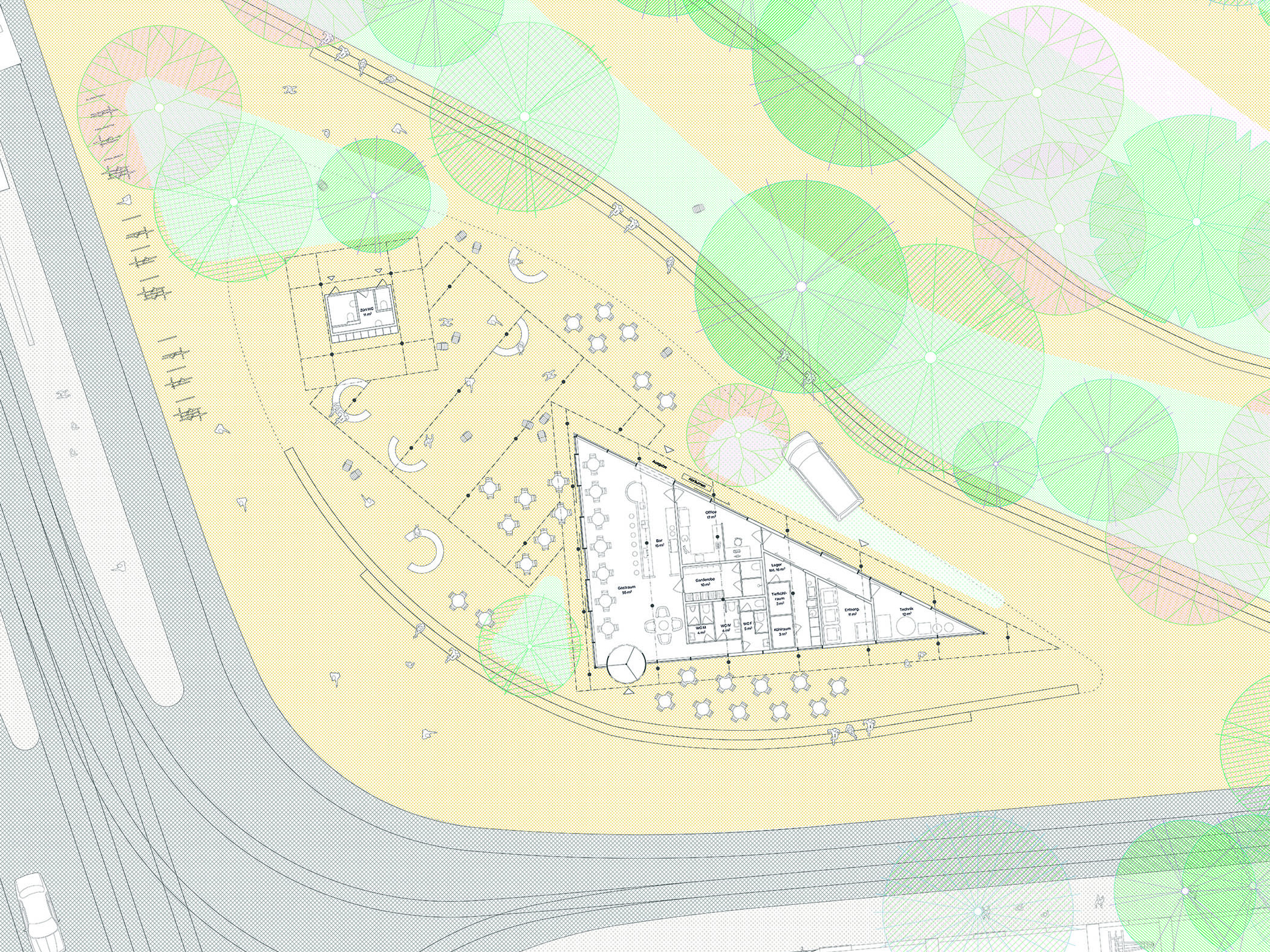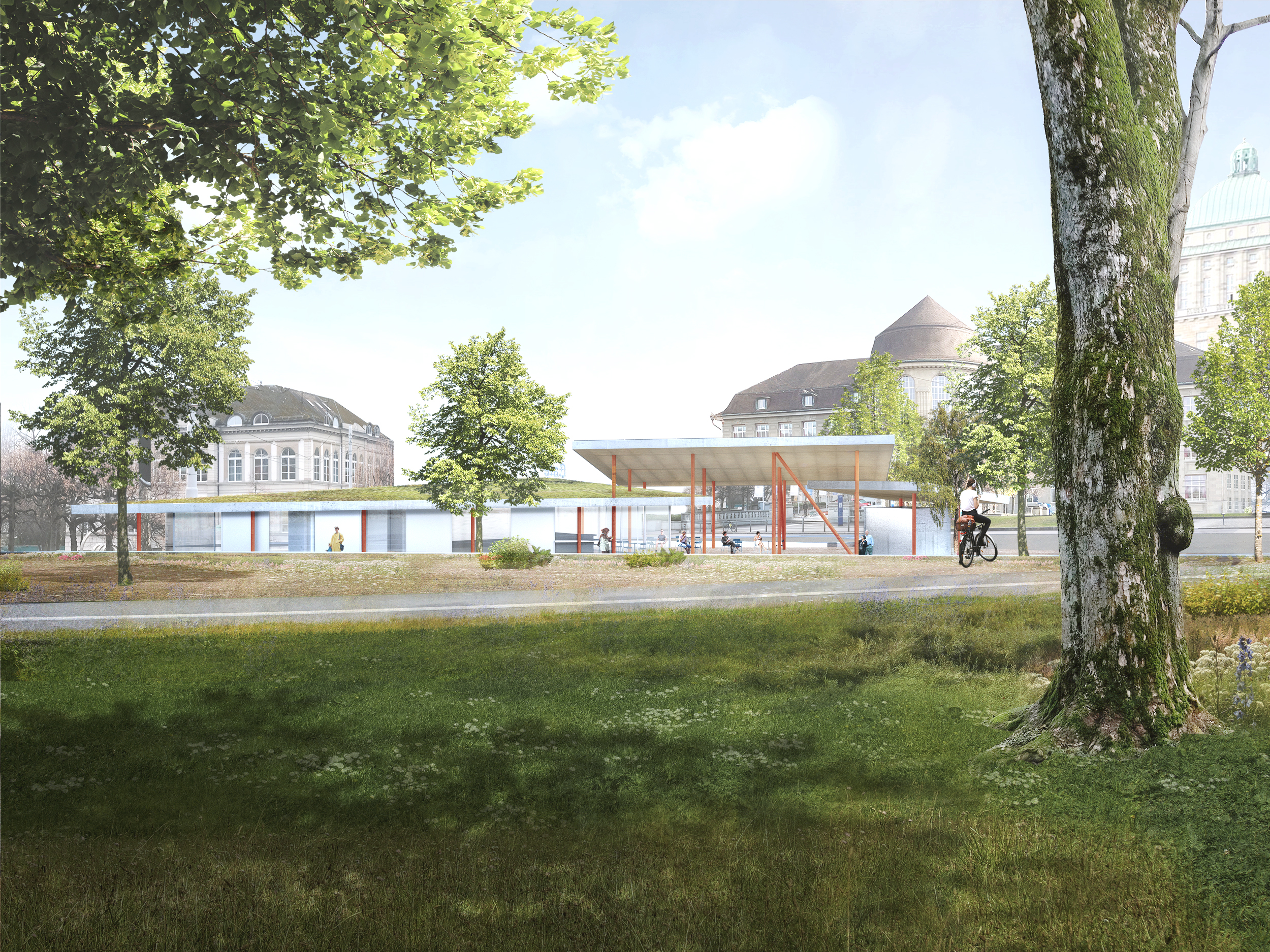 Mit dem Wettbewerb »Pavillon im Park« bietet sich die Chance ein Scharnier zwischen den unterschiedlichen Institutionen des Universitätsquartiers Zürich, und dem Gloriapark als Freiraum und Erholungsort, zu schaffen. Das Park-Café schafft einen, dem Standort gerechten, repräsentativen und einladenden, Ort mit metropolitanem Massstab. Zugleich aber behält der Neubau einen intimen Massstab, schafft Orte unterschiedlicher Qualität, die zum Verweilen einladen, und fügt sich organisch in die bestehende Parklandschaft ein. So entsteht ein lebendiger Treffpunkt zwischen Park und Stadt!