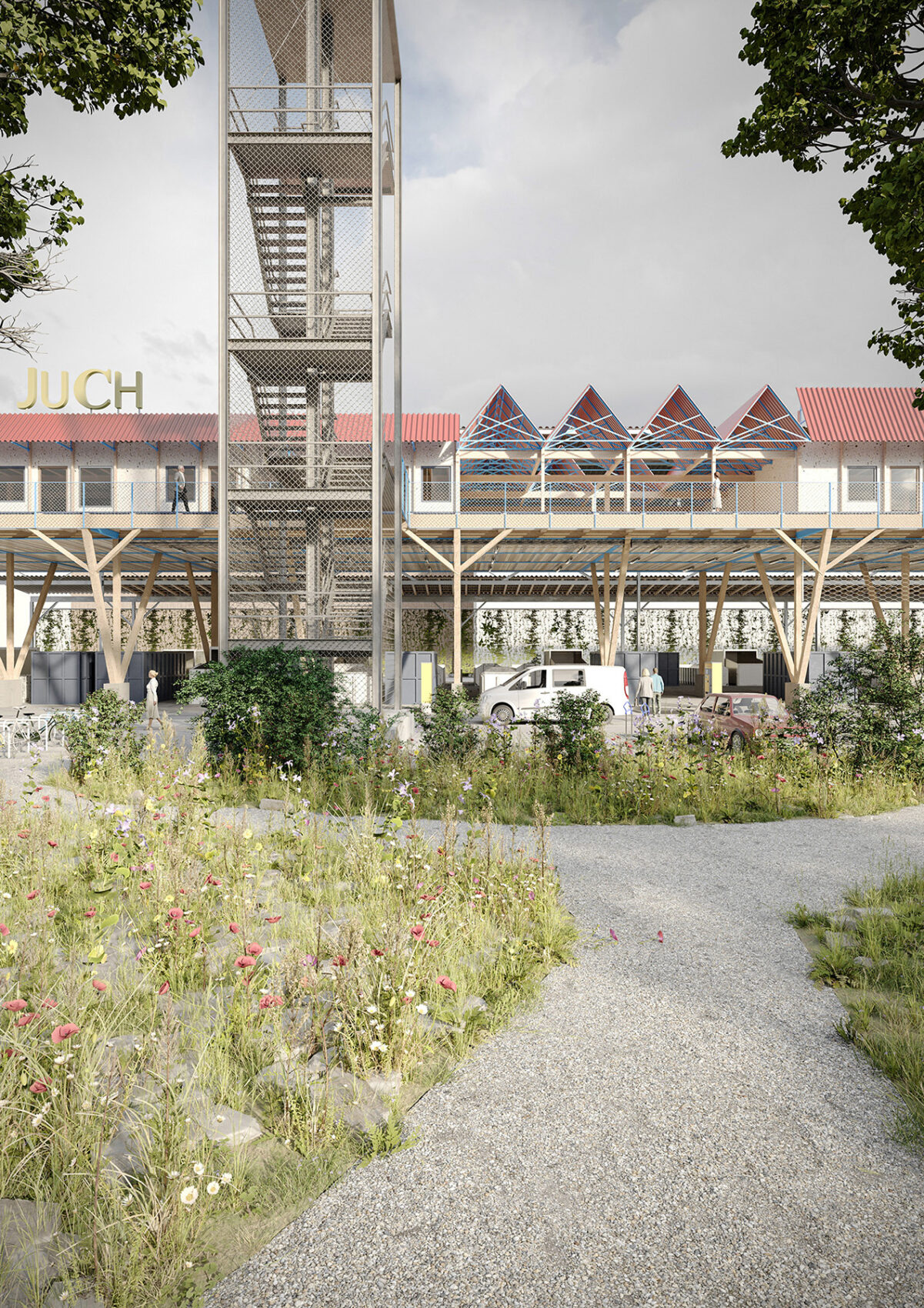 Das Projekt schlägt vor, das Areal als öffentliche und offene Stadt-Infrastruktur für alle Bewohnenden zu verstehen. Rund ein Drittel der Parzelle bleibt unversiegelt und ist öffentlich zugänglich. Die Offenheit des Gebäudes und sein Selbstverständnis als öffentliche Infrastruktur drücken sich auch direkt in der Architektur aus. Si wird das Obergeschoss über einen Laubengang an eine geplante Fussgängerbrücke angeschlossen. Die Treppe des Recyclingzentrums Hagenholz wird als objet trouvé in ihrer gesamten Höhe am neuen Ort wieder aufgebaut. Sie erschliesst den Laubengang und schafft zugleich einen öffentlichen Aussichtspunkt.