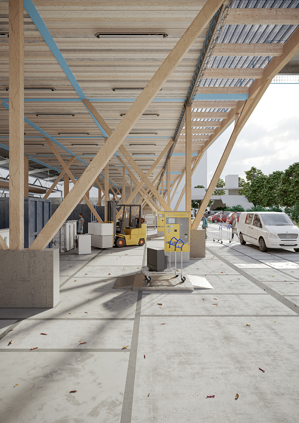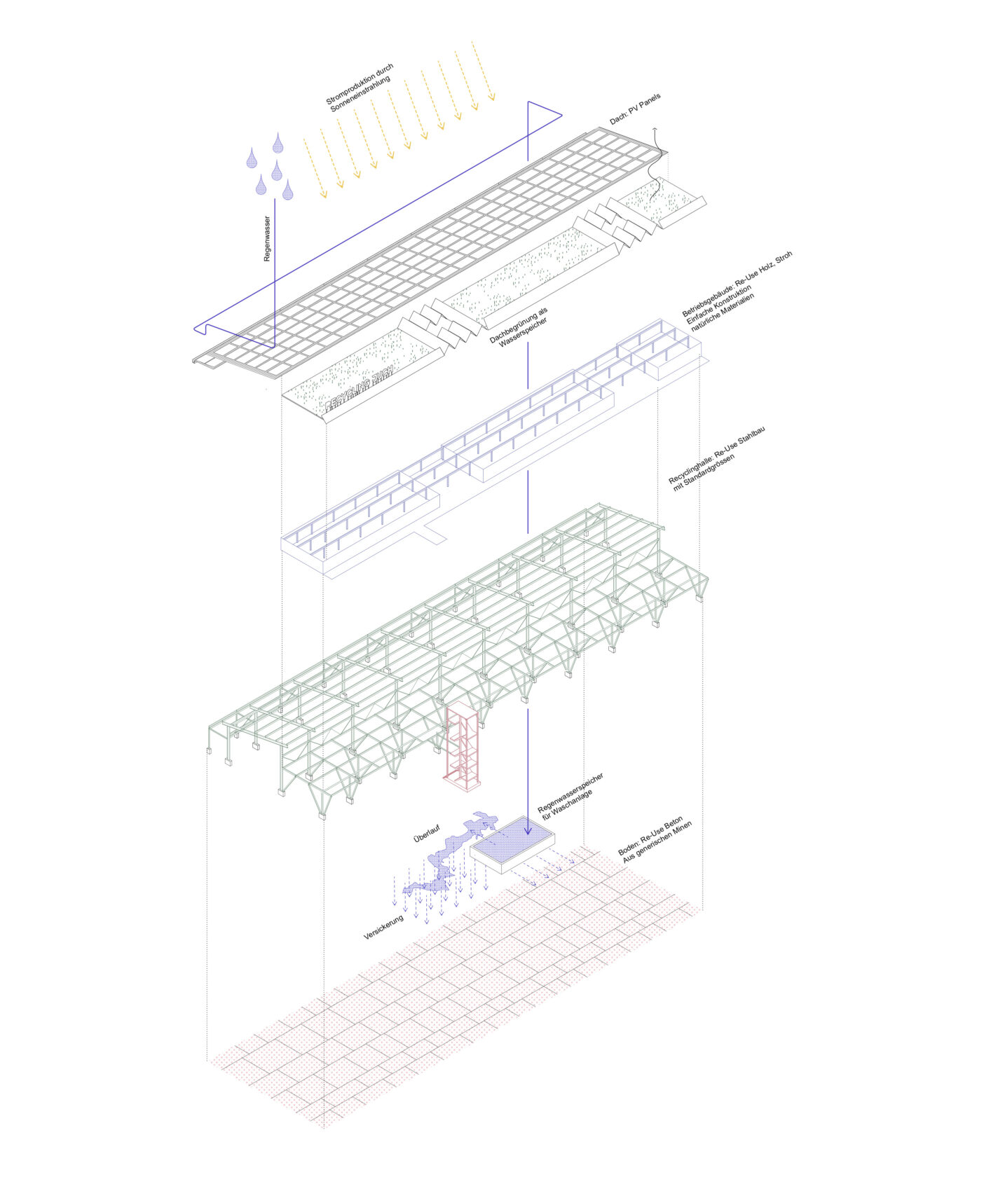 Das Projekt ist als flexible Struktur gedacht und bleibt für zukünftige Nutzungen adaptierbar. Die Halle ist als dreischiffige Basilika ausgebildet. Sie ist aus der Nutzung als Recyclingzentrum entwickelt, kann jedoch auch andere Programme aufnehmen – vom Werkhof bis zur Lager- oder Markthalle.