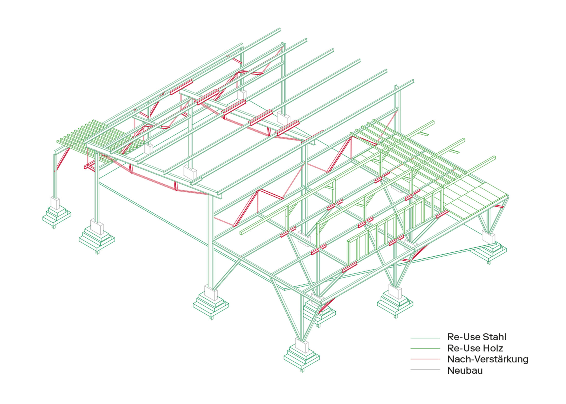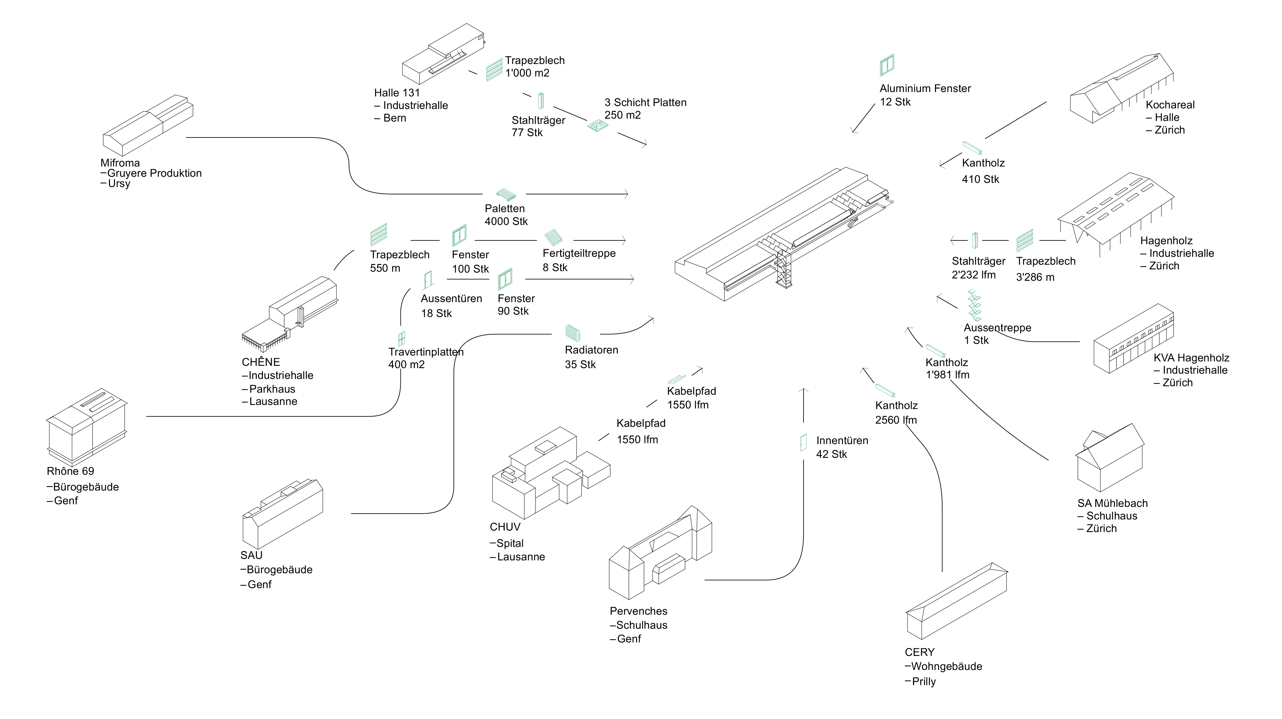 Die Tragstruktur sowie ein grosser Teil der Gebäudehülle sind aus wiederverwendeten Bauteilen geplant. Dafür entwickelten wir eine Re-Use-Strategie, die nur bedingt von spezifischen Materialminen abhängt. Das Projekt basiert auf einer adaptiven Logik, welche häufig vorkommende Bauteile in ihren üblichen Dimensionen aufnehmen kann. Im Ausdruck wird das Thema Re-Use gestalterisch weder als Besonderheit inszeniert noch versteckt, sondern als selbstverständlicher Teil der Architektur verstanden.