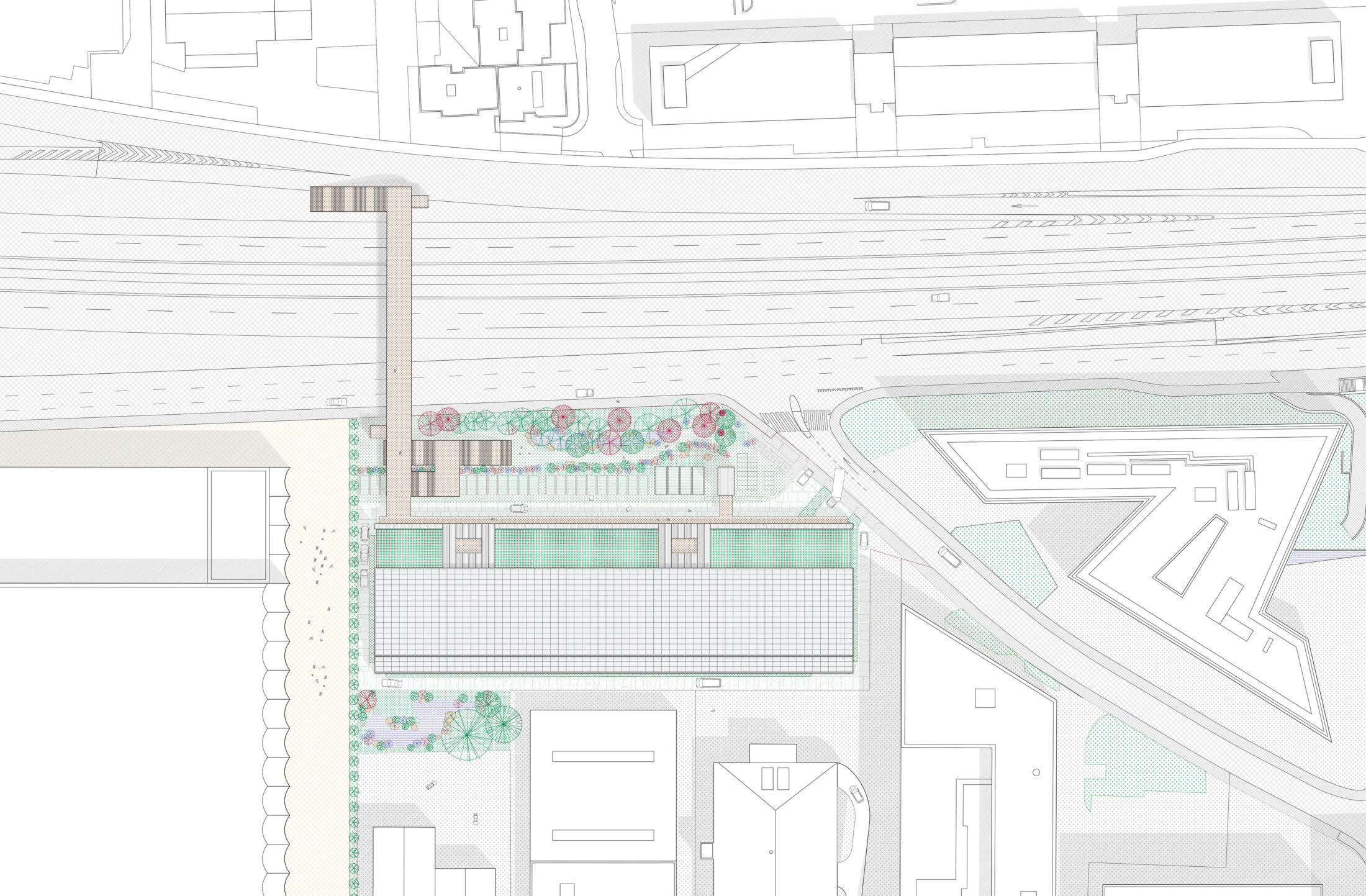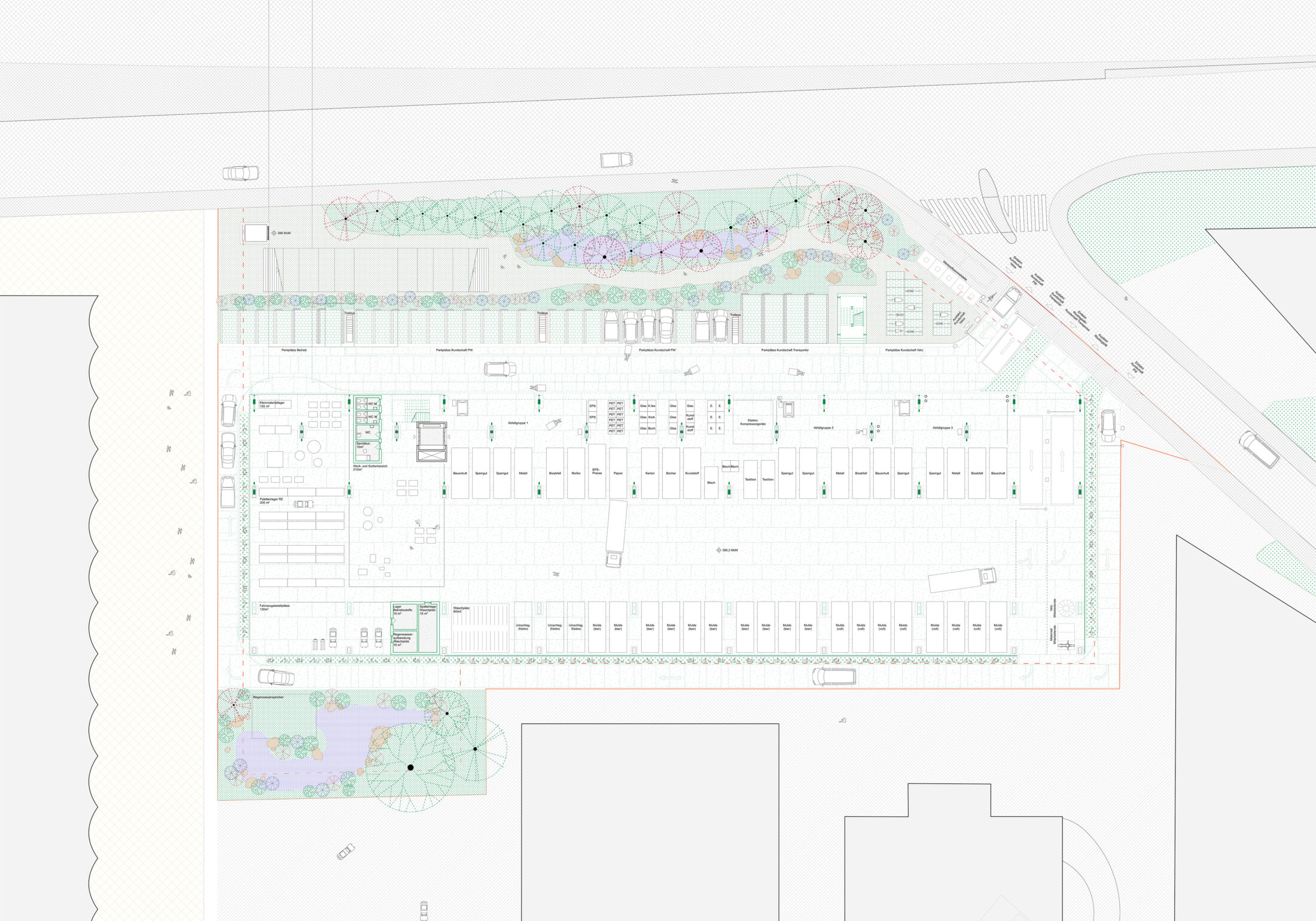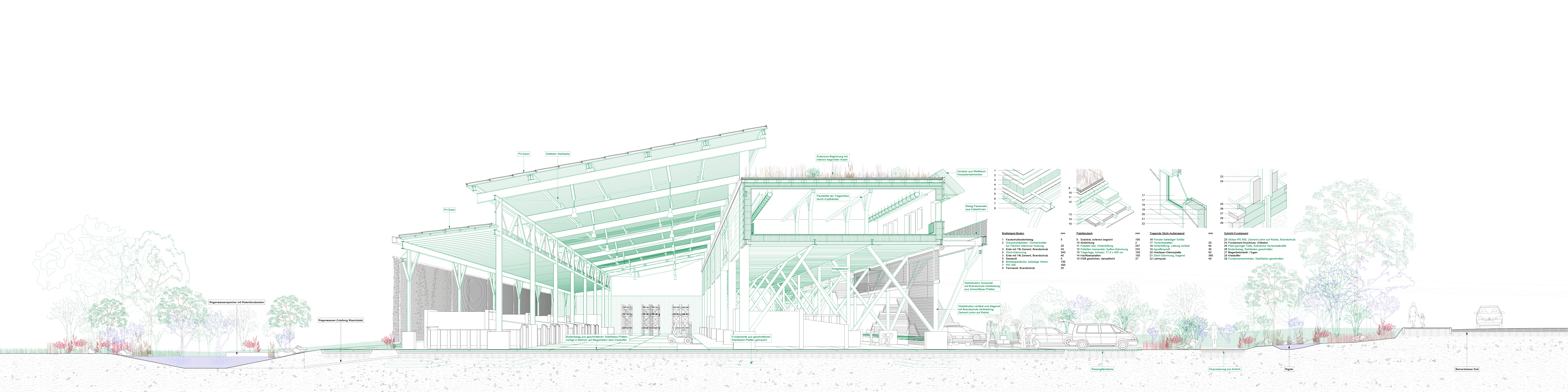 The roof is used for rainwater harvesting and energy production via photovoltaics. A rainwater and drainage management system is planned for the entire site. Water will be allowed to infiltrate onsite. Roof runoff will be collected on the south side and used for the car wash. The surplus will be channeled into an open retention basin. In the event of heavy rainfall, excess water can be discharged into municipal networks via a safety overflow.