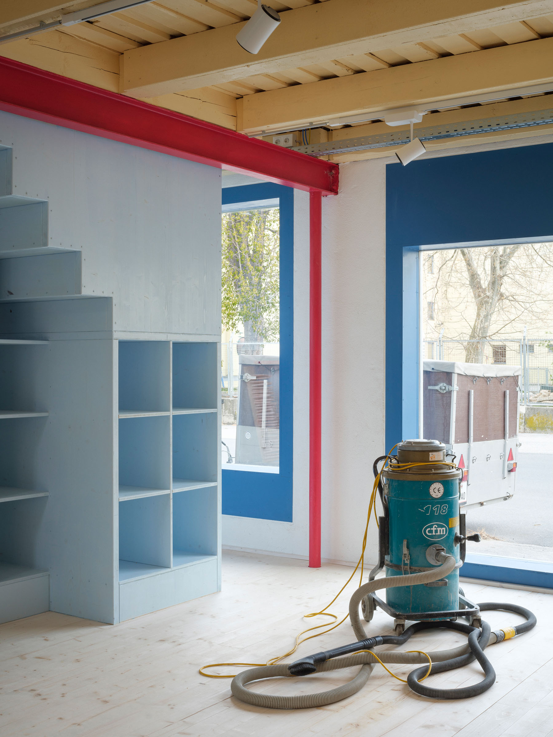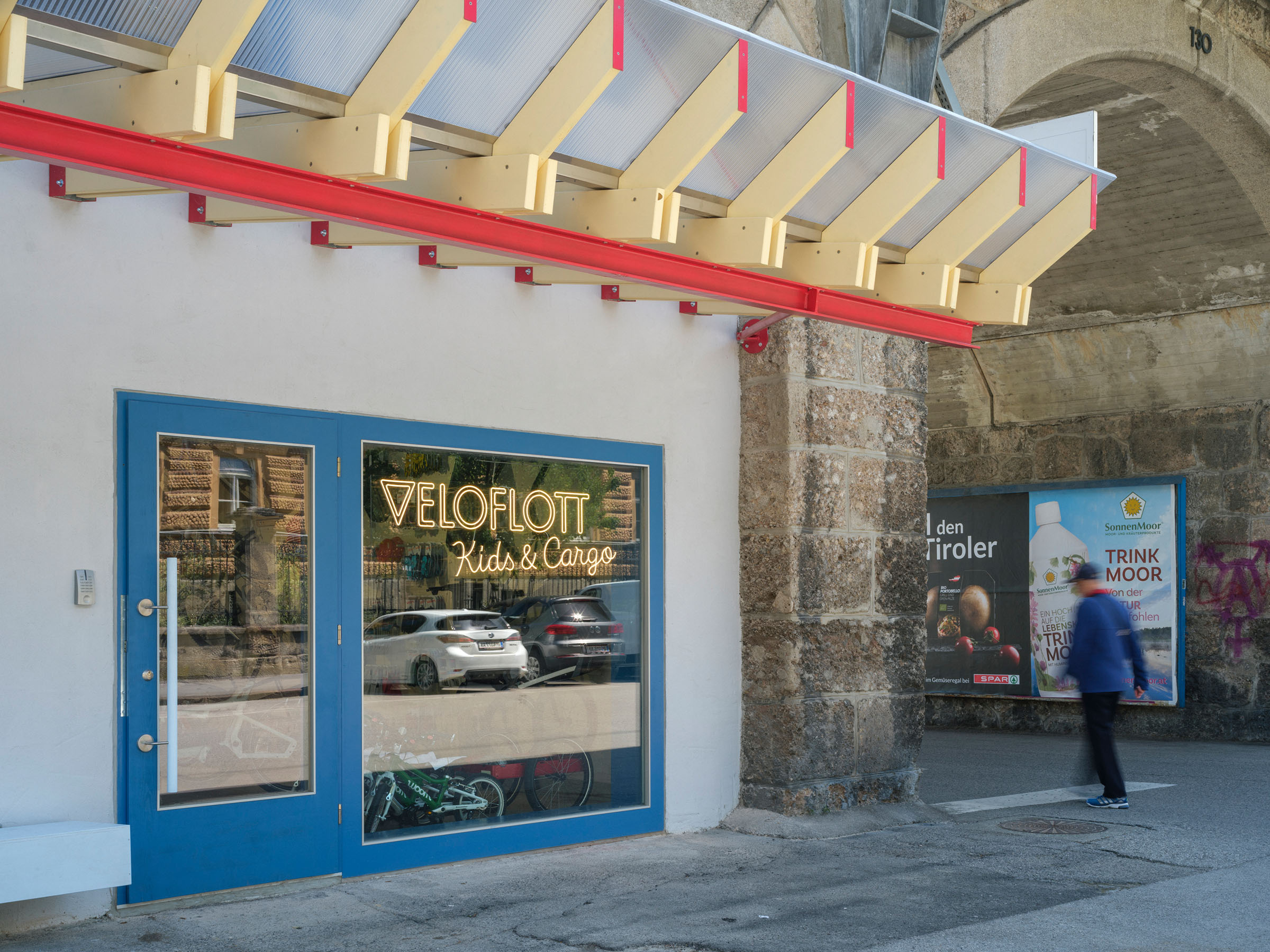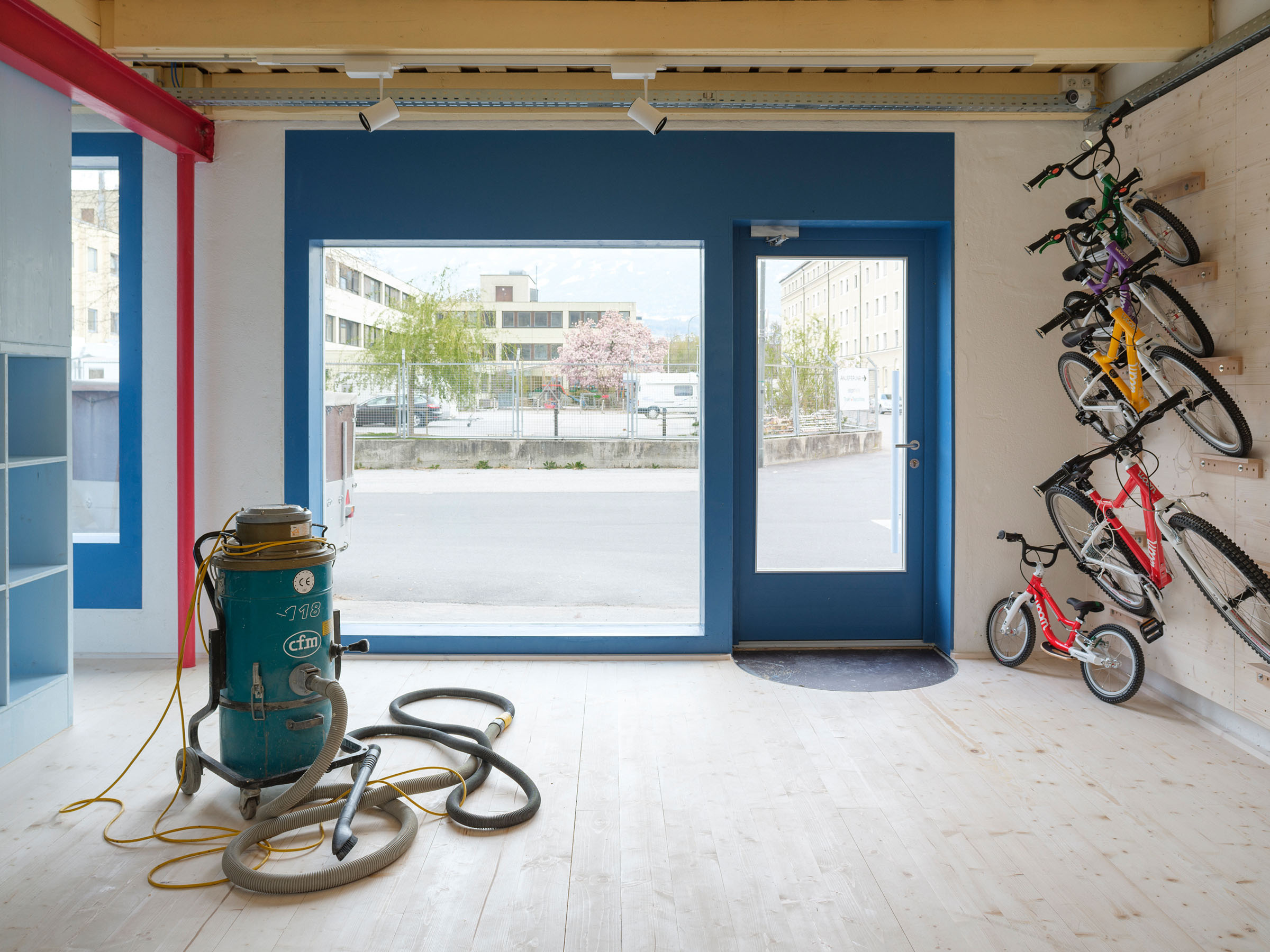 We were asked to convert a former darts club into a bicycle shop with storage and a small workshop on the upper floor. In addition to the maximum utilization of the existing structure and the re-use of existing materials, we tried to use the program in order to create new qualities of public space.