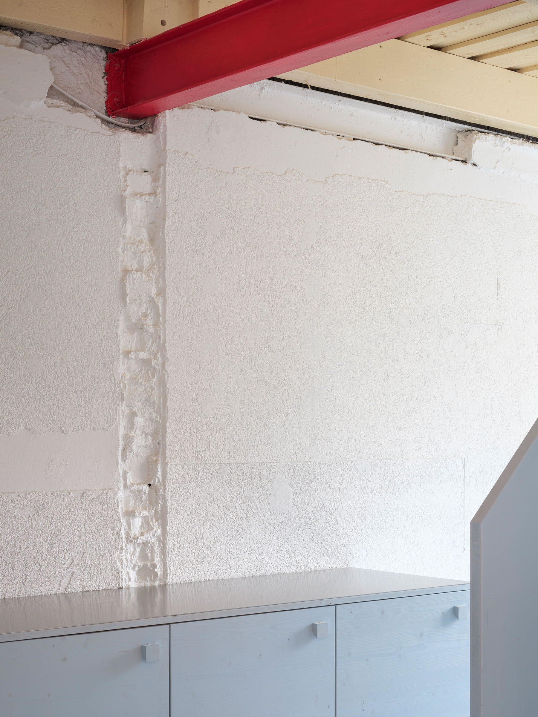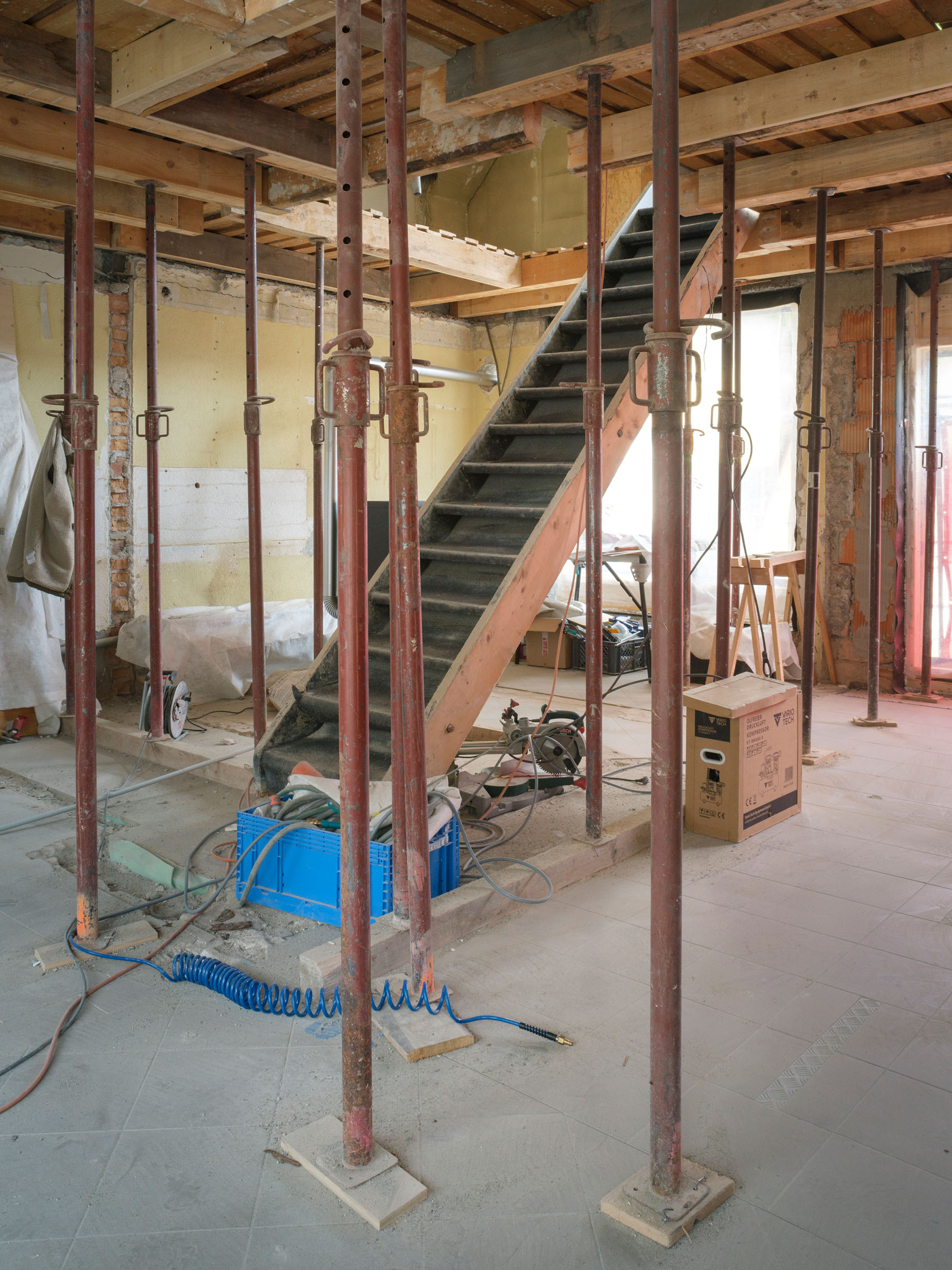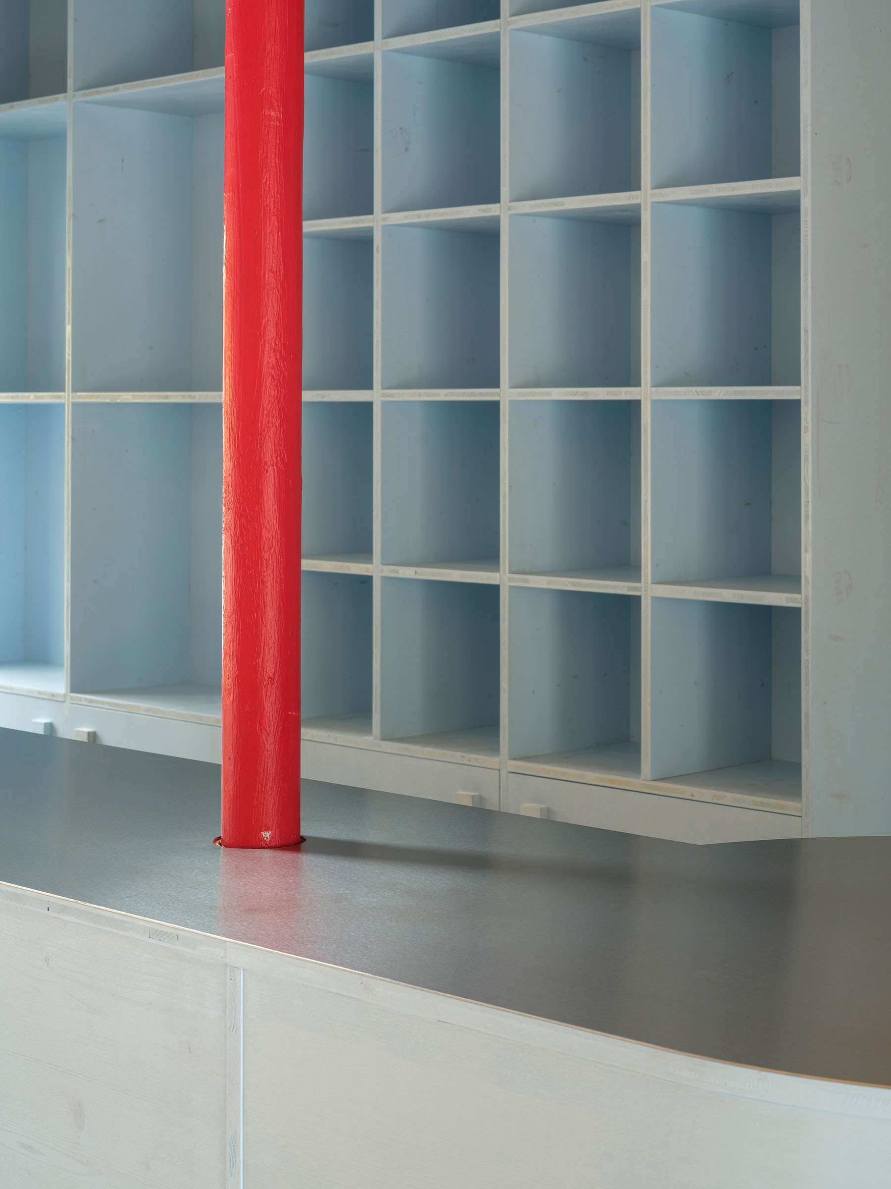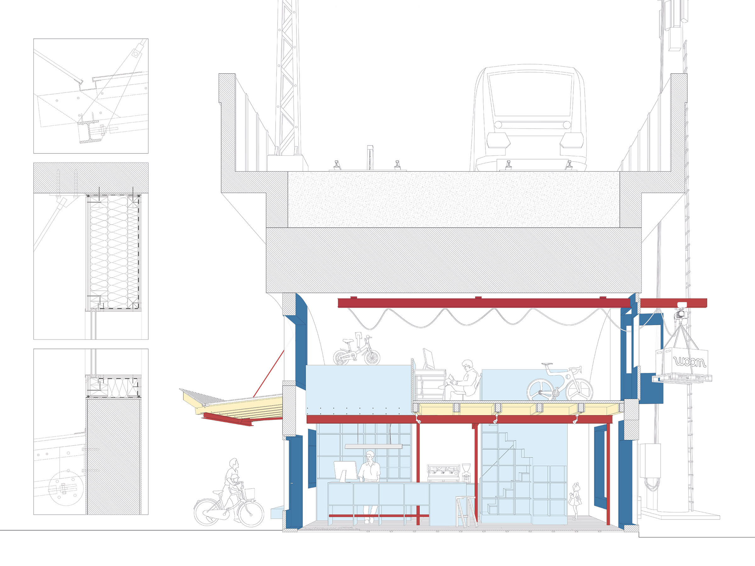 We were asked to convert a former darts club into a bicycle shop with storage and a small workshop on the upper floor. In addition to the maximum utilization of the existing structure and the re-use of existing materials, we tried to use the program in order to create new qualities of public space.