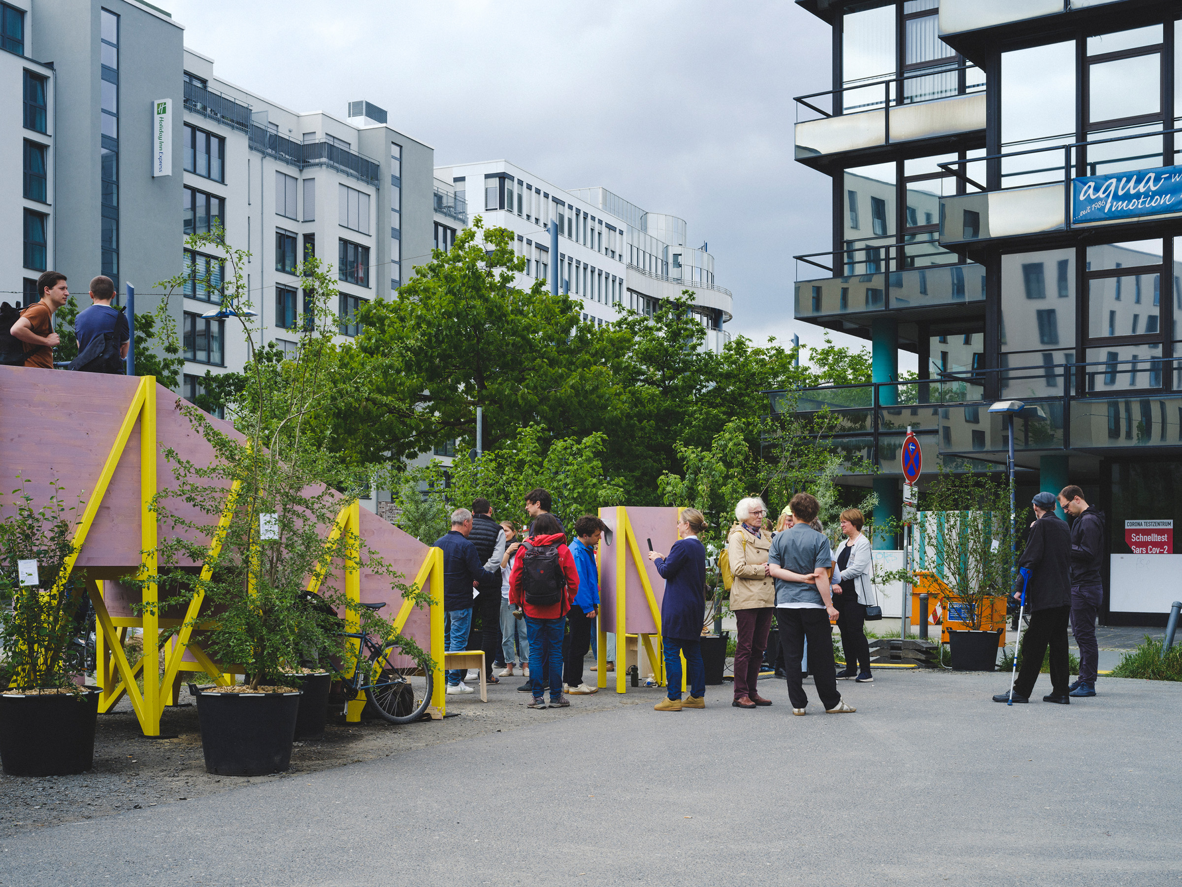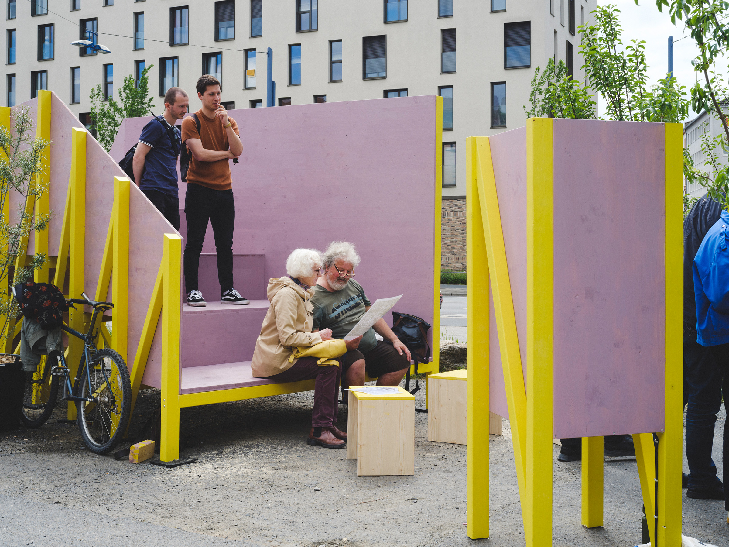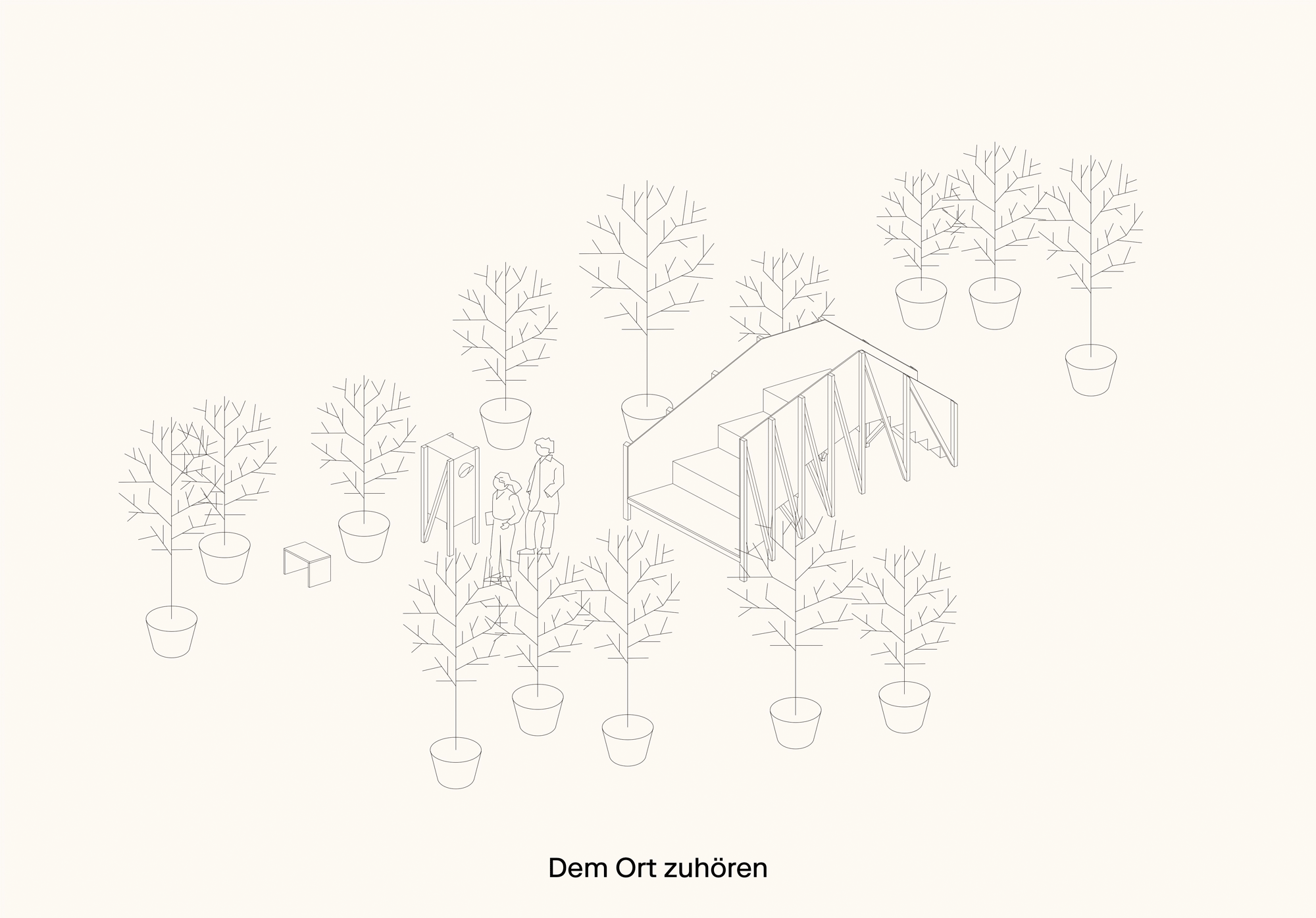 A tribune that invites to sit, stay, and reorientates the view. A sound box that tells stories of the place. Temporary vegetation which provides shade and becomes a habitat for insects and small animals.